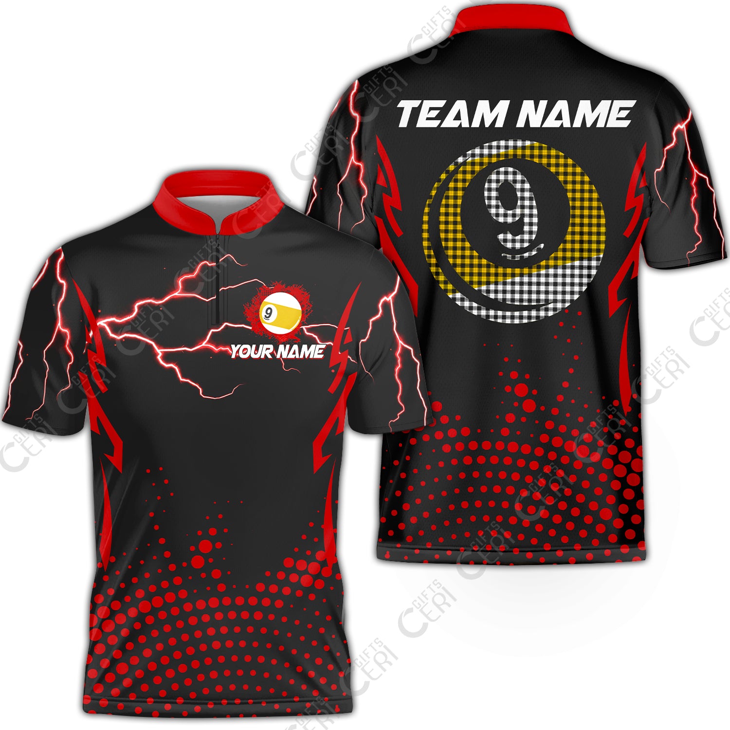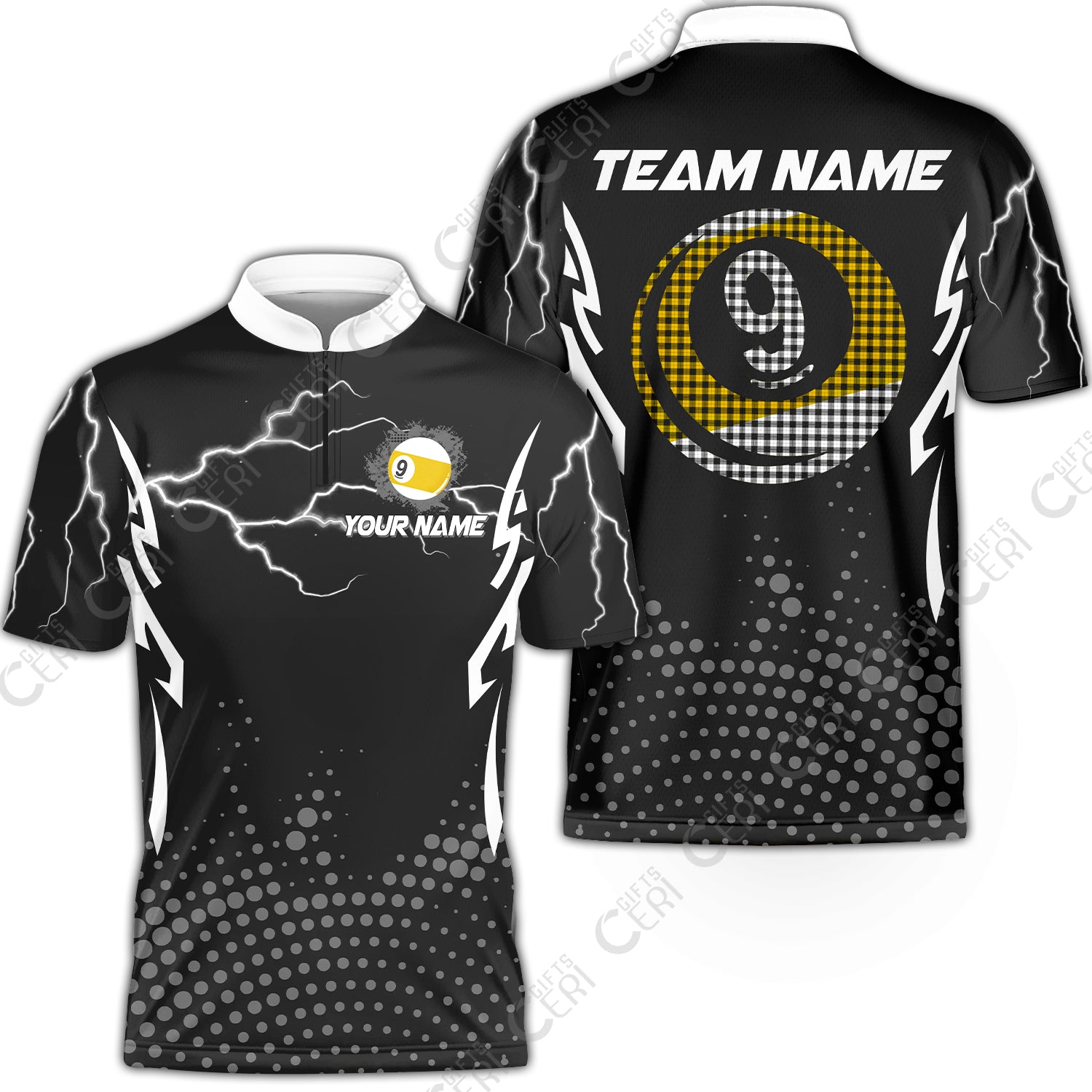 Customized Billiards Stand Collar Quarter-Zip Short Sleeve Jersey, Lightning Graphics With Dots 9 Ball Pool Jersey