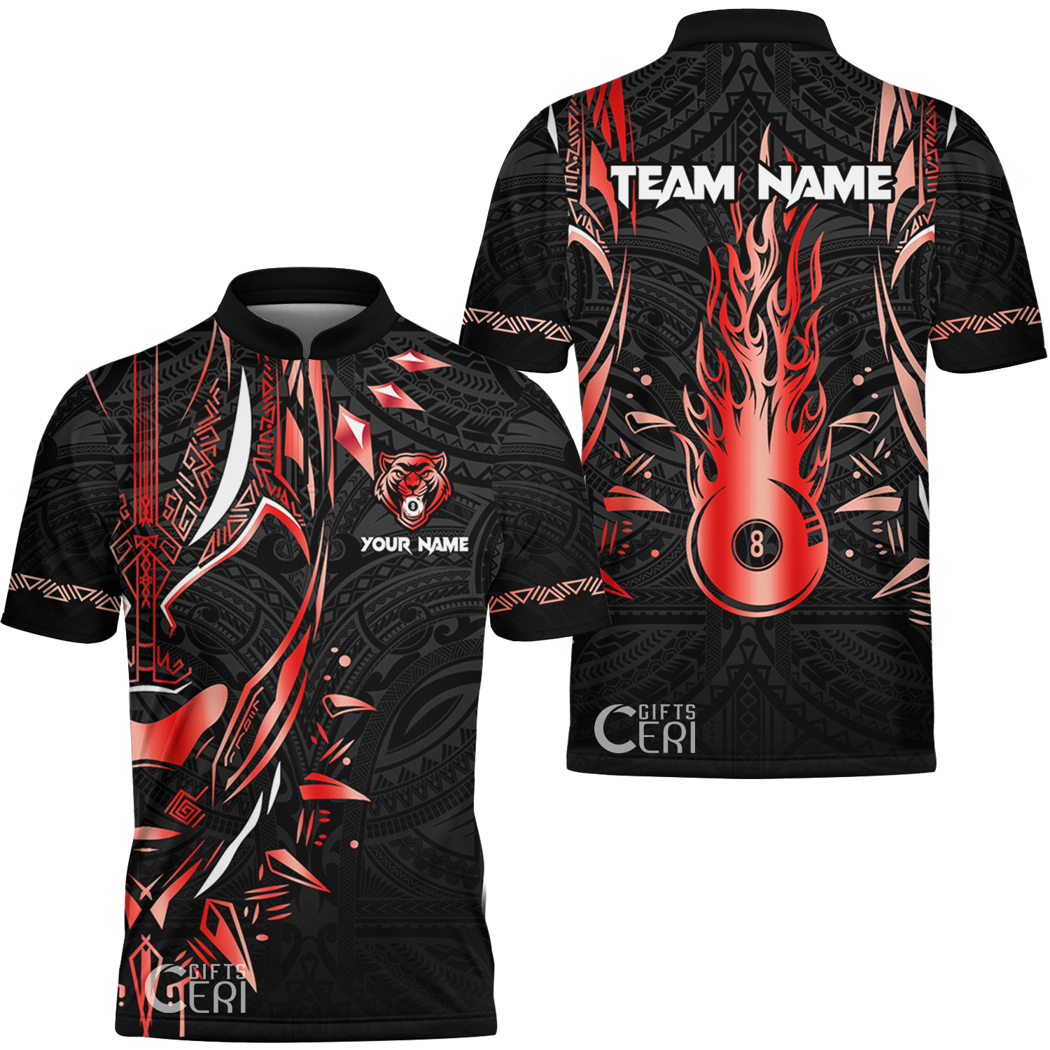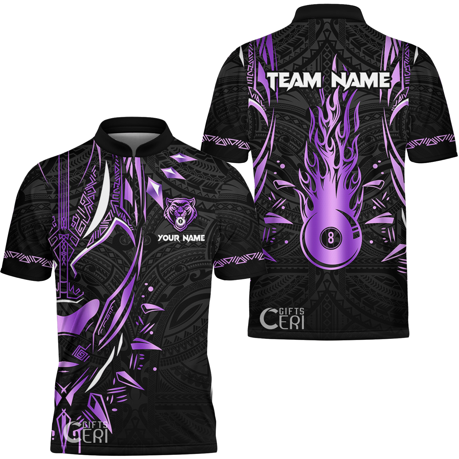 Customized Billiards Stand Collar Quarter-Zip Short Sleeve Jersey, Panther Forever Flaming 8 Ball Personalized Jersey
