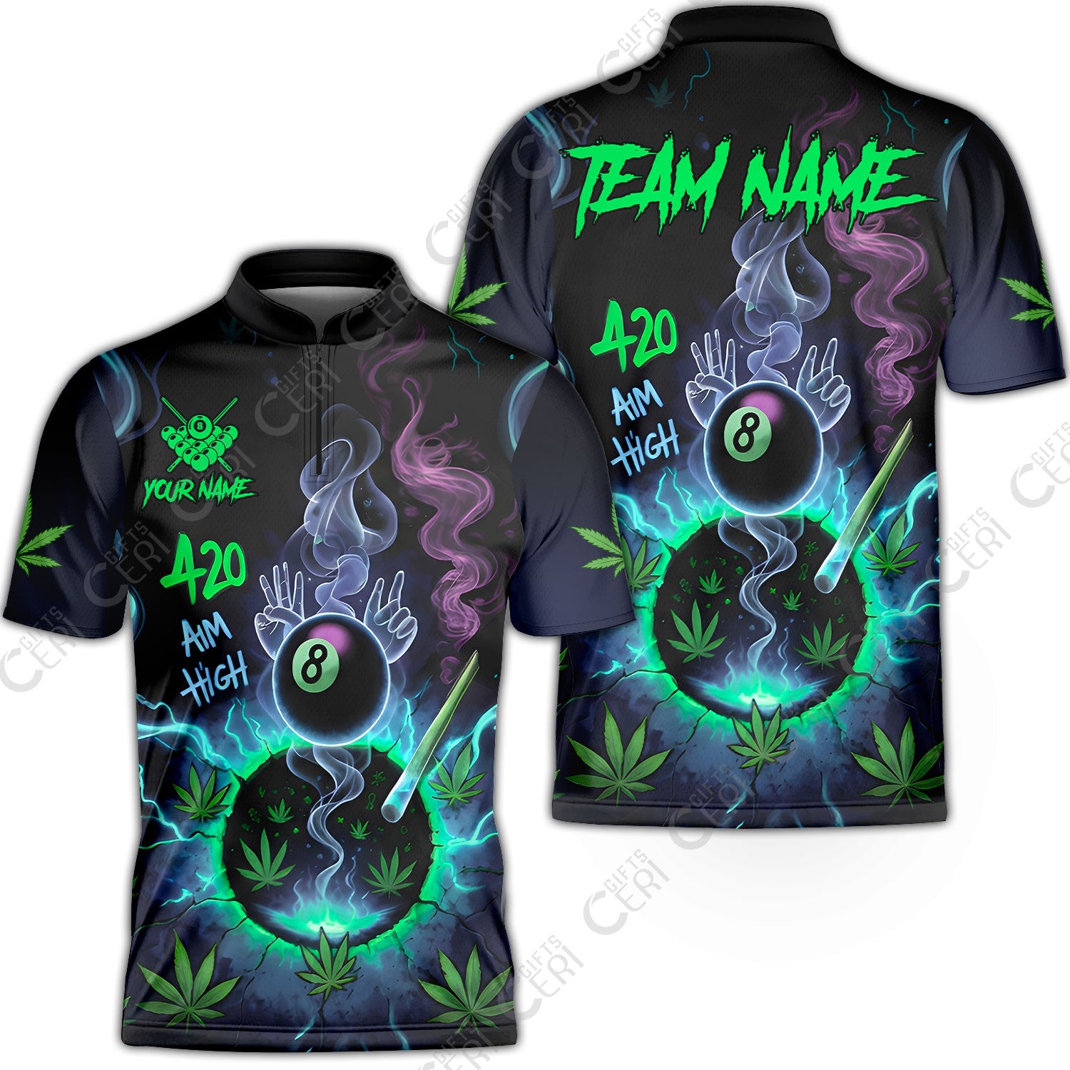 Customized Billiards Stand Collar Quarter-Zip Short Sleeve Jersey, Personalized 420 Aim High 8 Ball Pool Team Jersey