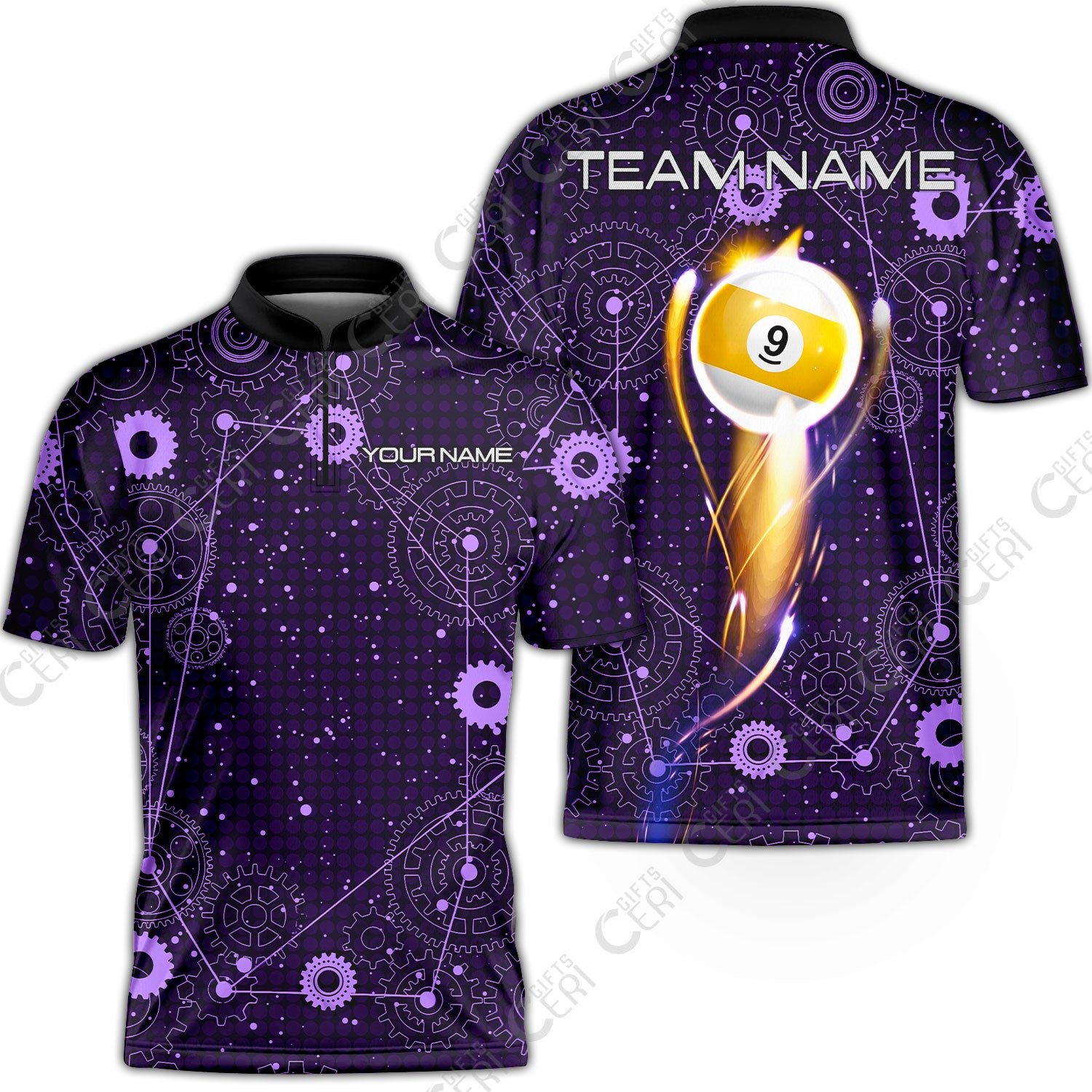 Customized Billiards Stand Collar Quarter-Zip Short Sleeve Jersey, Personalized 9 Ball Lighting Gear Pattern Jersey