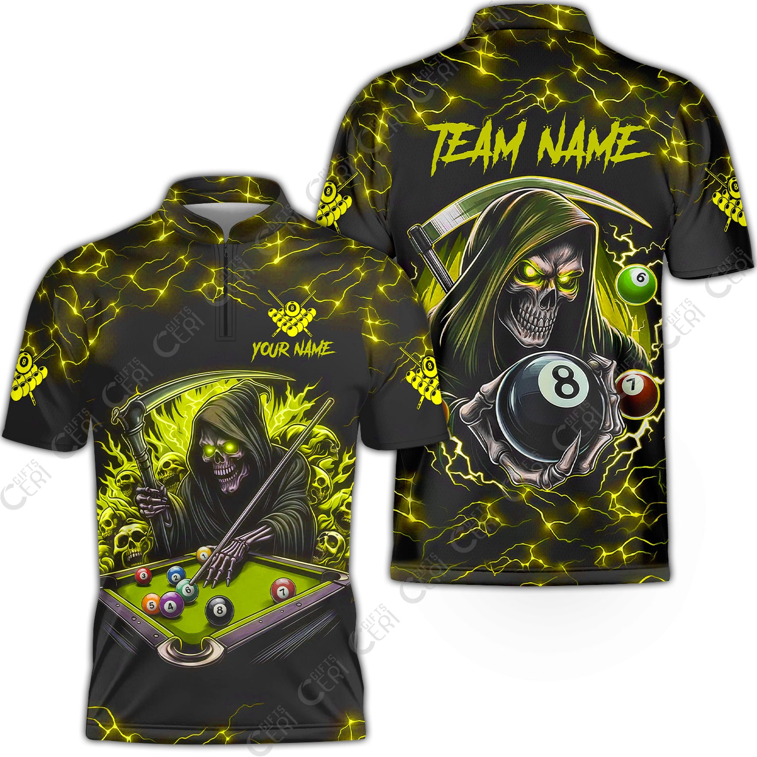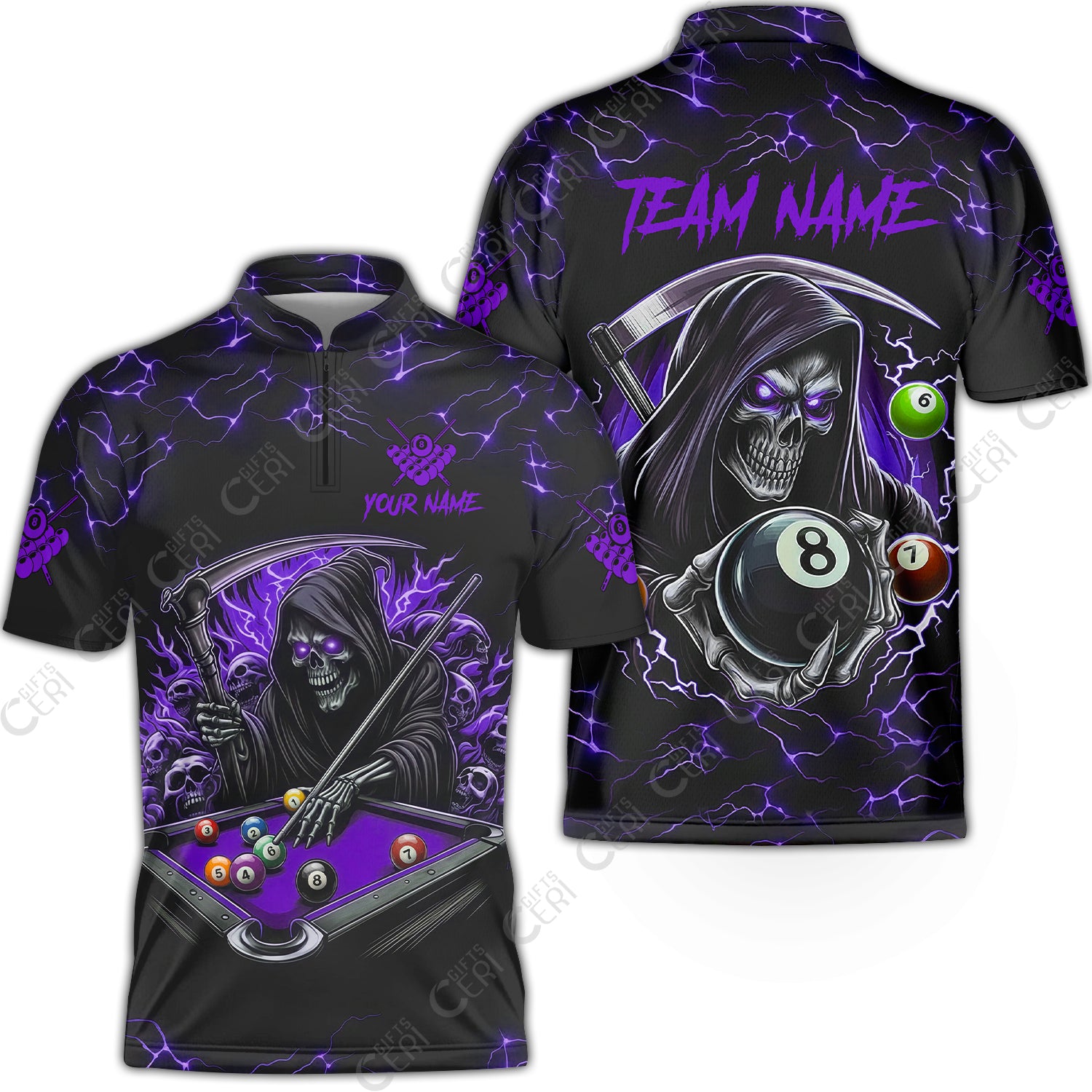 Customized Billiards Stand Collar Quarter-Zip Short Sleeve Jersey, Personalized Billiard Death Skeleton 8 Ball Jersey