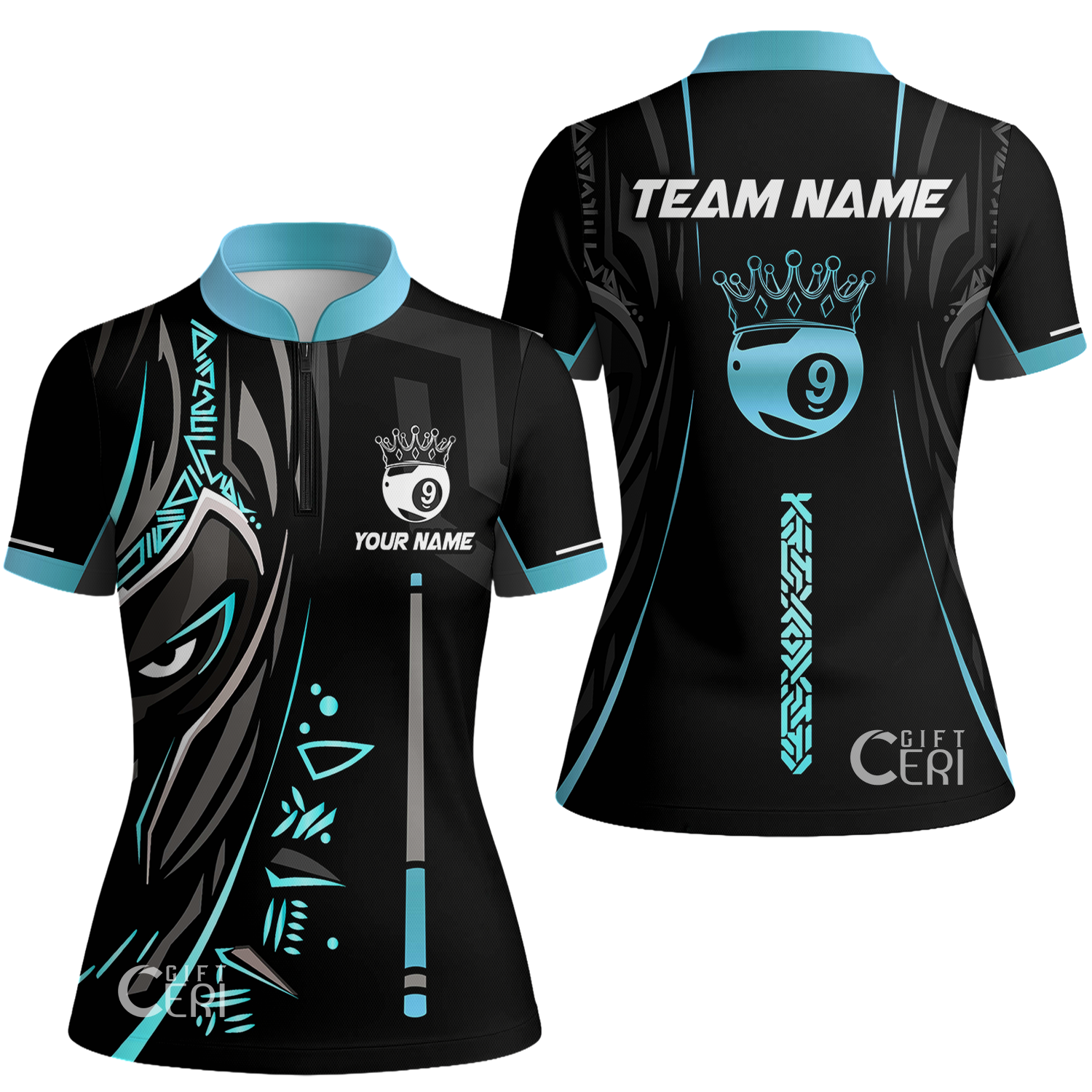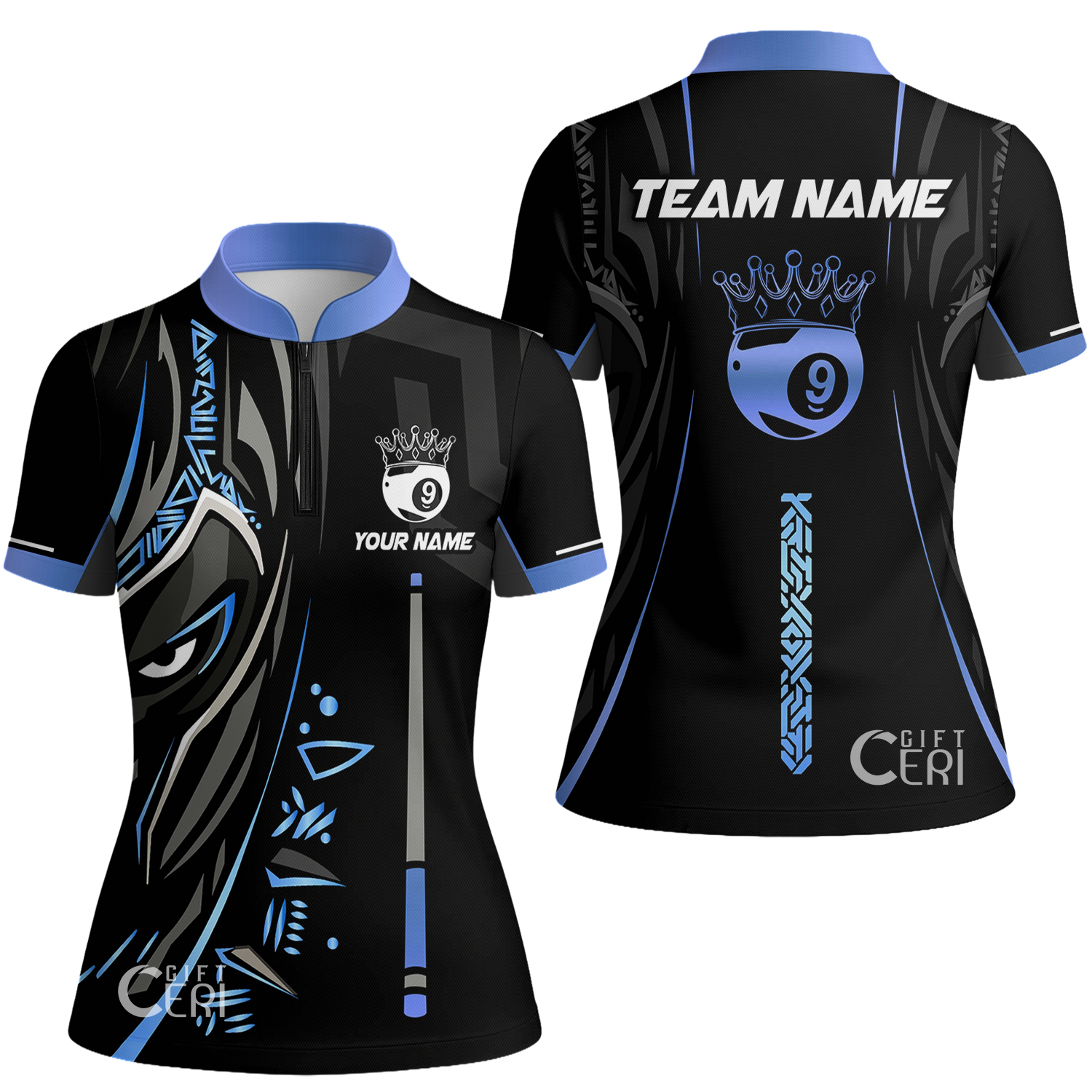 Customized Billiards Stand Collar Quarter Zip Short Sleeve Women's Shirt, Black Panther With Snooker Cue and Crown 9 Ball Pool Jersey