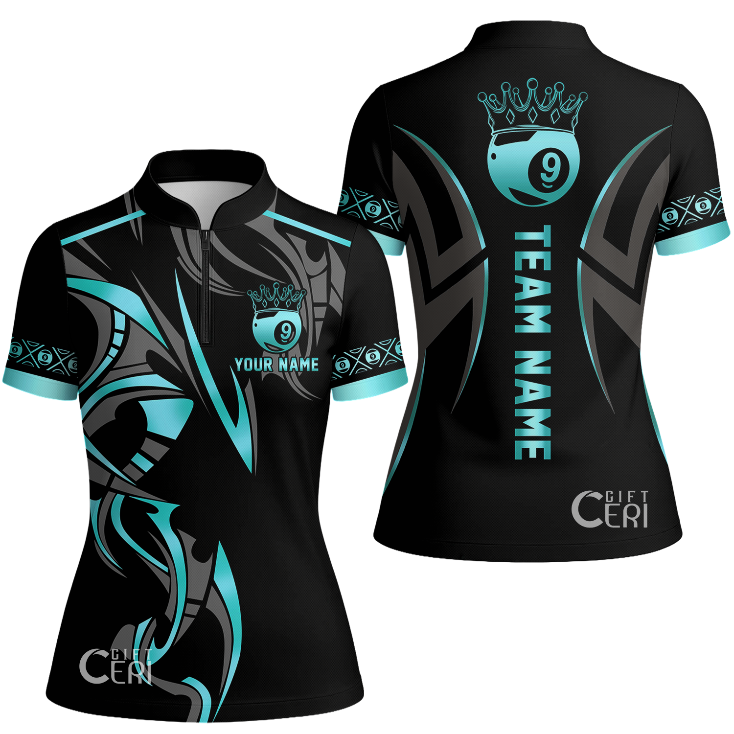 Customized Billiards Stand Collar Quarter Zip Short Sleeve Women's Shirt, Crown 9 Ball Esport Jersey