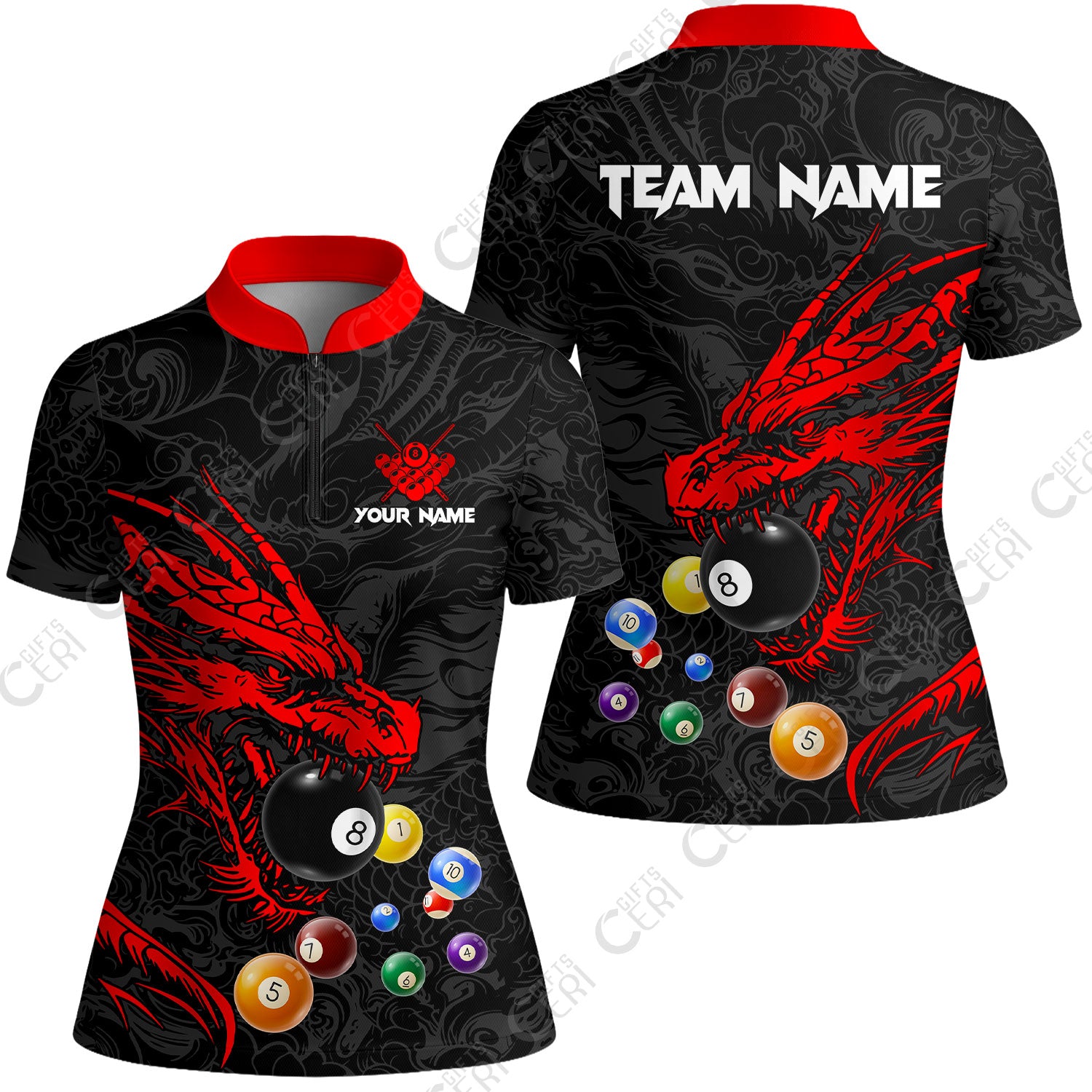 Customized Billiards Stand Collar Quarter Zip Short Sleeve Women's Shirt, Dragon Billiard, 8 Ball Jersey
