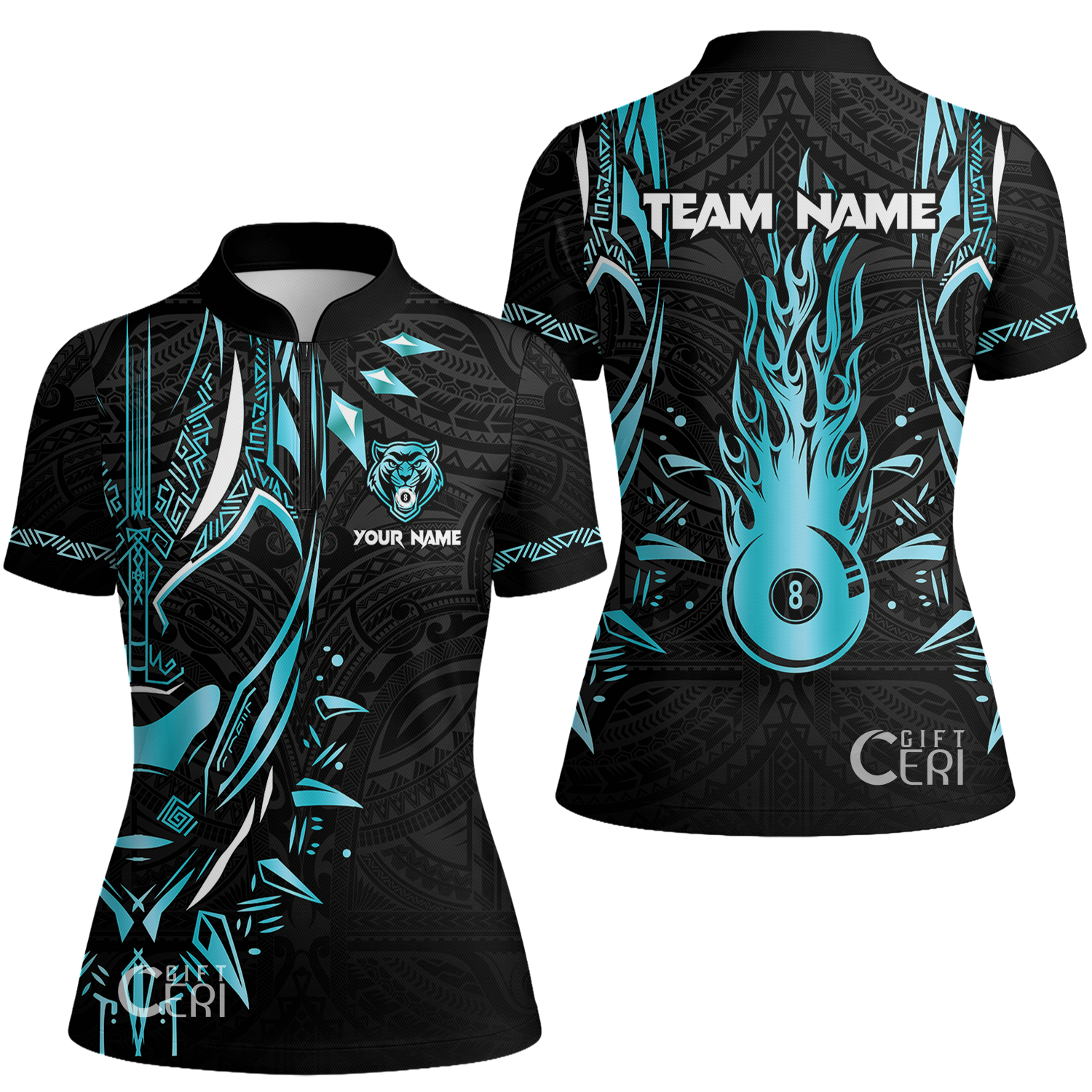 Customized Billiards Stand Collar Quarter Zip Short Sleeve Women's Shirt, Panther Forever Flaming 8 Ball Jersey
