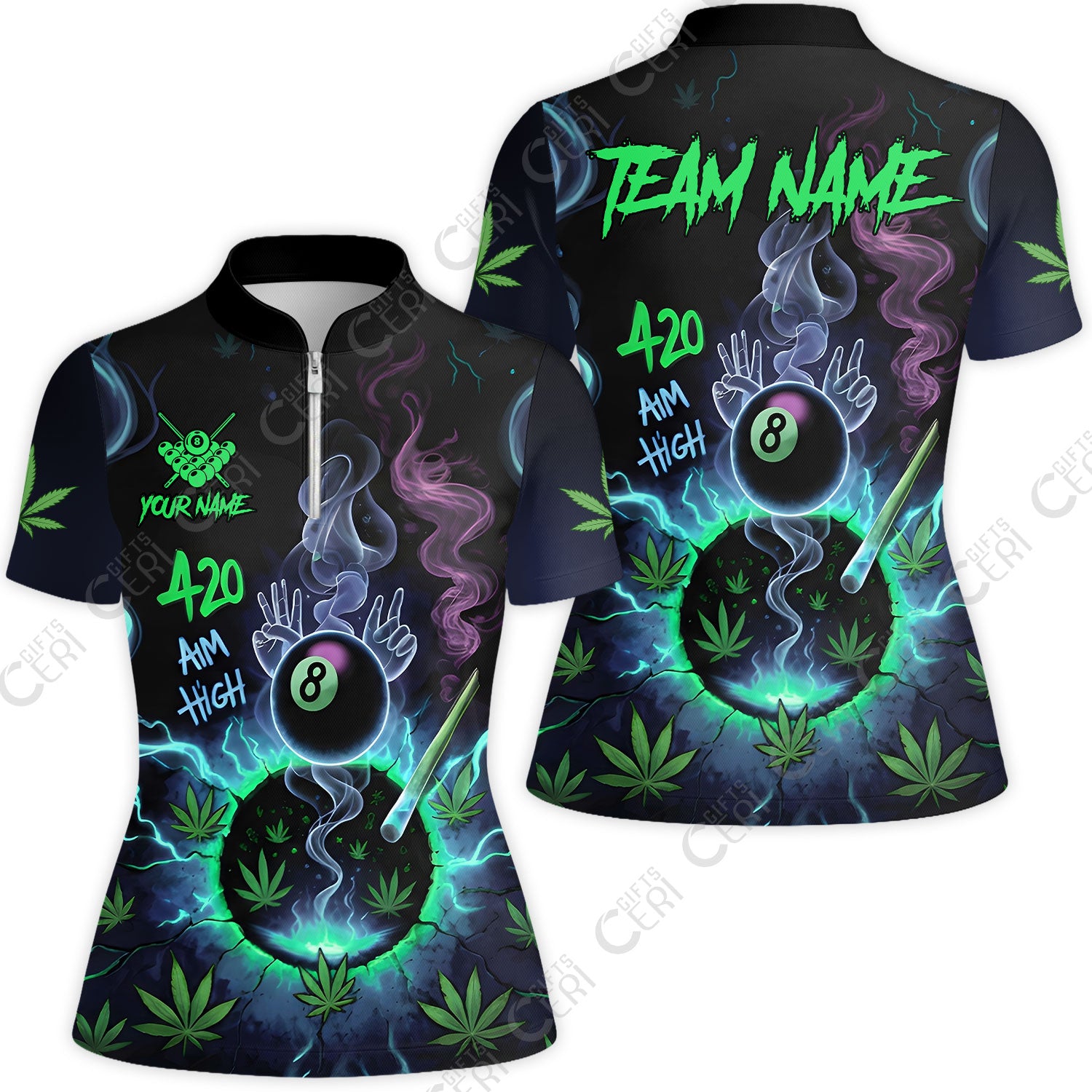 Customized Billiards Stand Collar Quarter Zip Short Sleeve Women's Shirt, Personalized 420 Aim High 8 Ball Pool Team Jersey