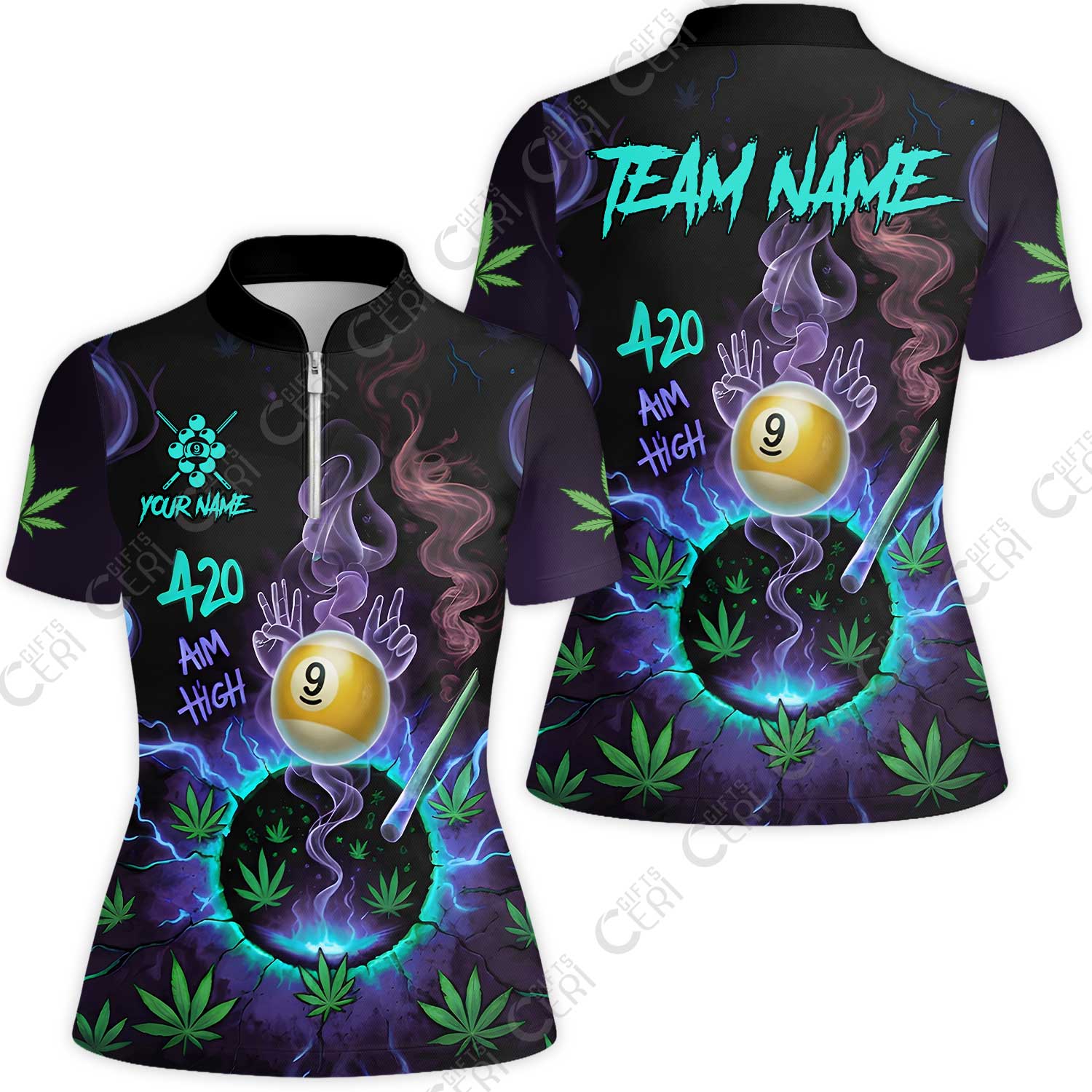 Customized Billiards Stand Collar Quarter Zip Short Sleeve Women's Shirt, Personalized 420 Aim High 9 Ball Pool Team Jersey