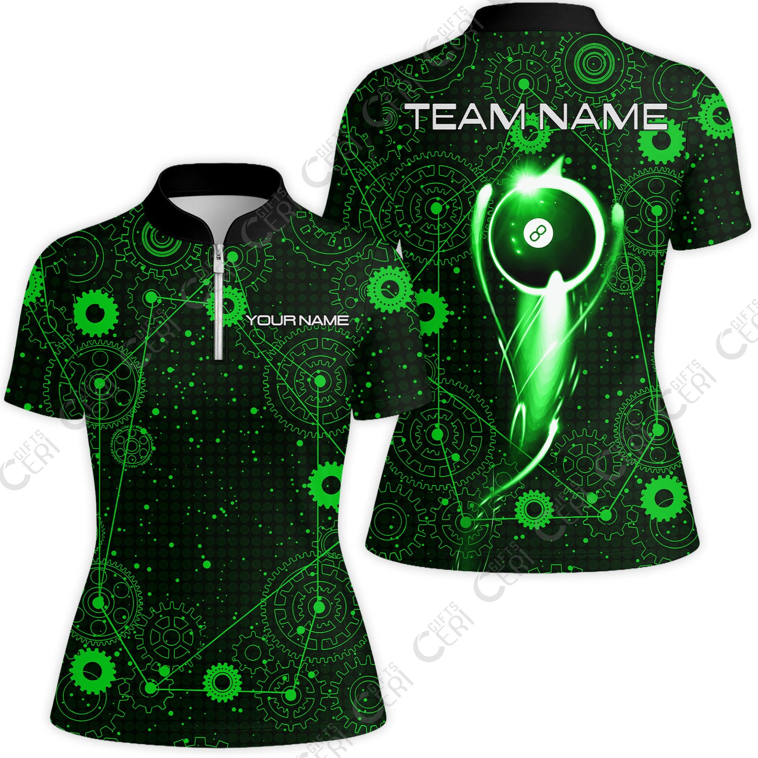 Customized Billiards Stand Collar Quarter Zip Short Sleeve Women's Shirt, Personalized 8 Ball Lighting Gear Pattern Jersey