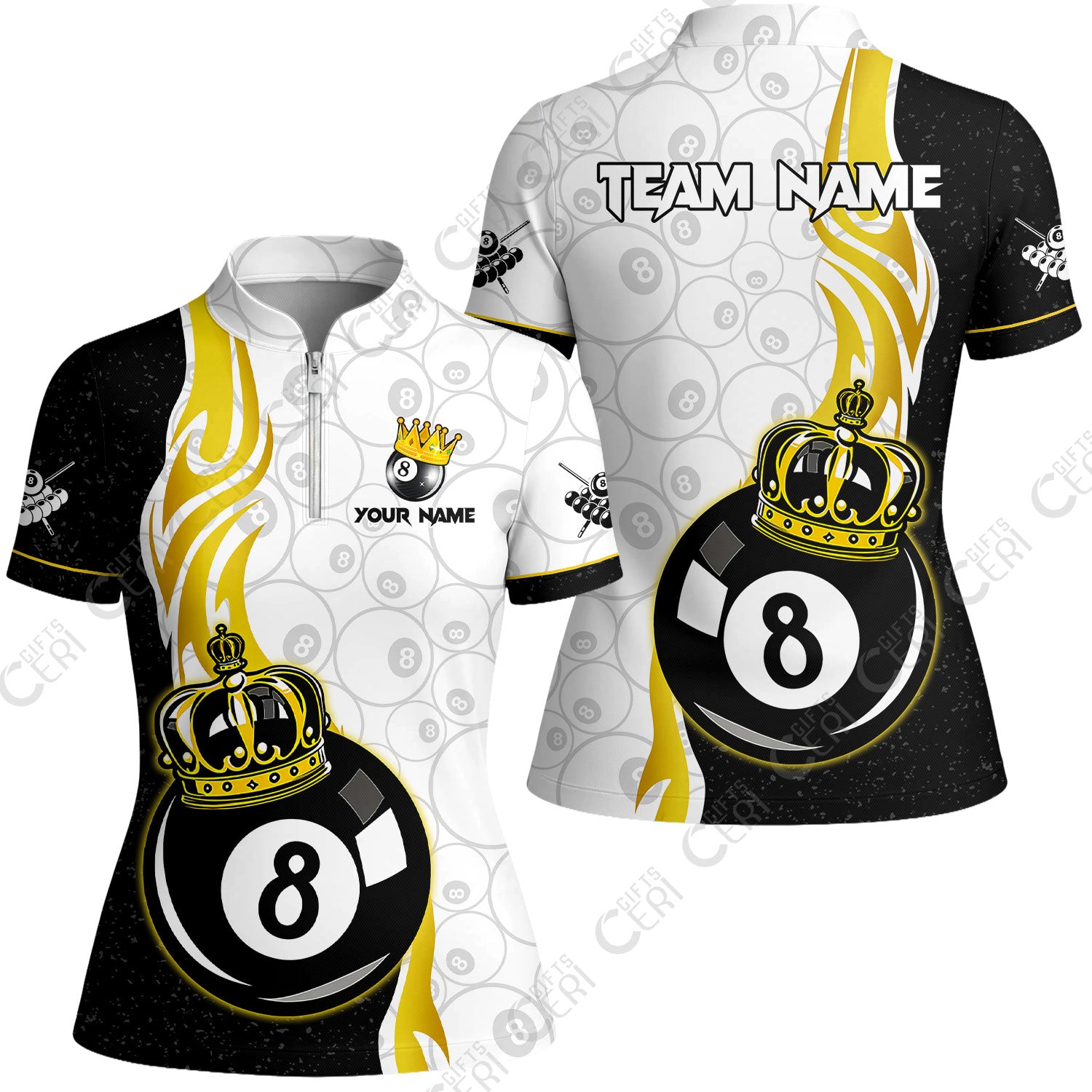 Customized Billiards Stand Collar Quarter Zip Short Sleeve Women's Shirt, Personalized 8 Ball Pool Crown Billiard Jersey