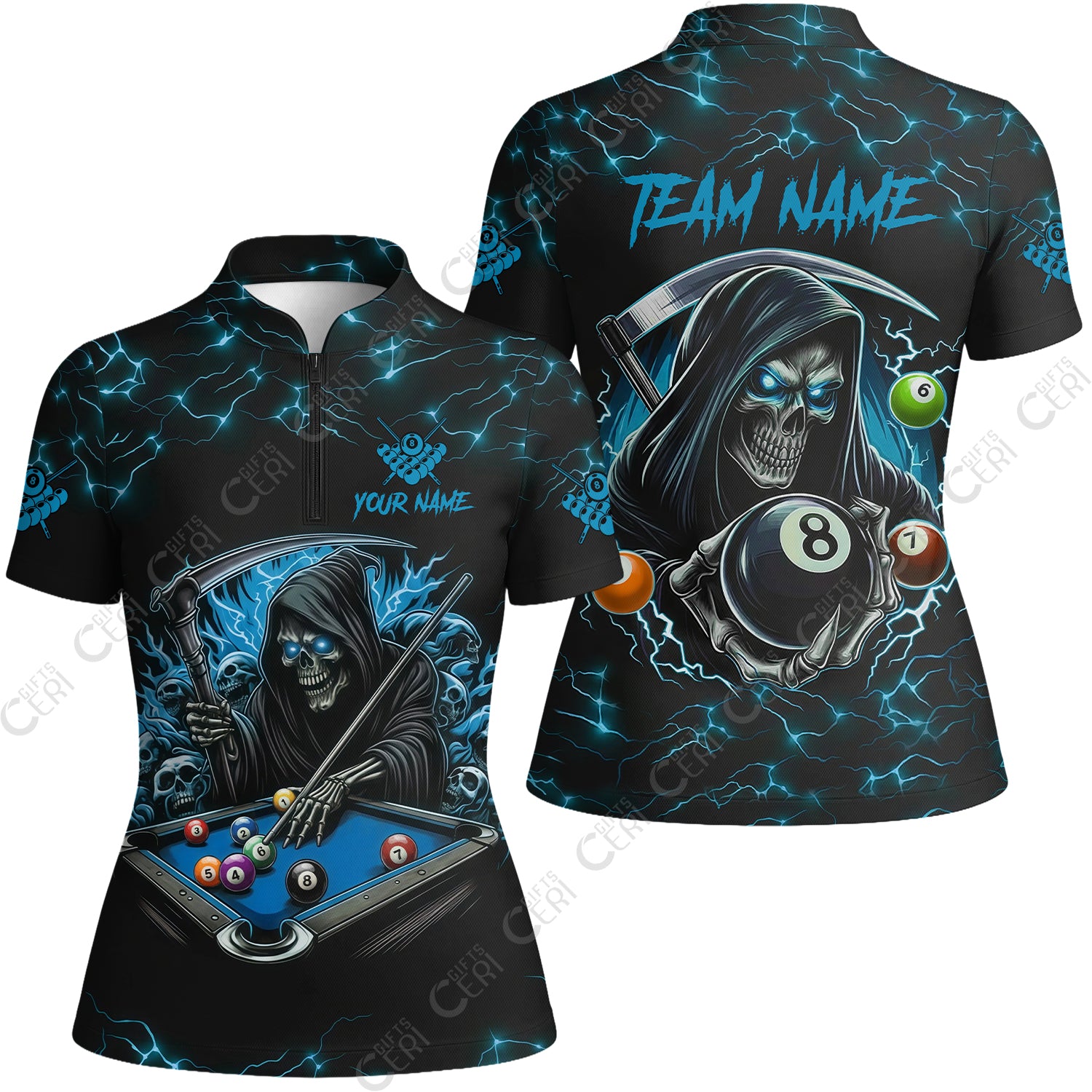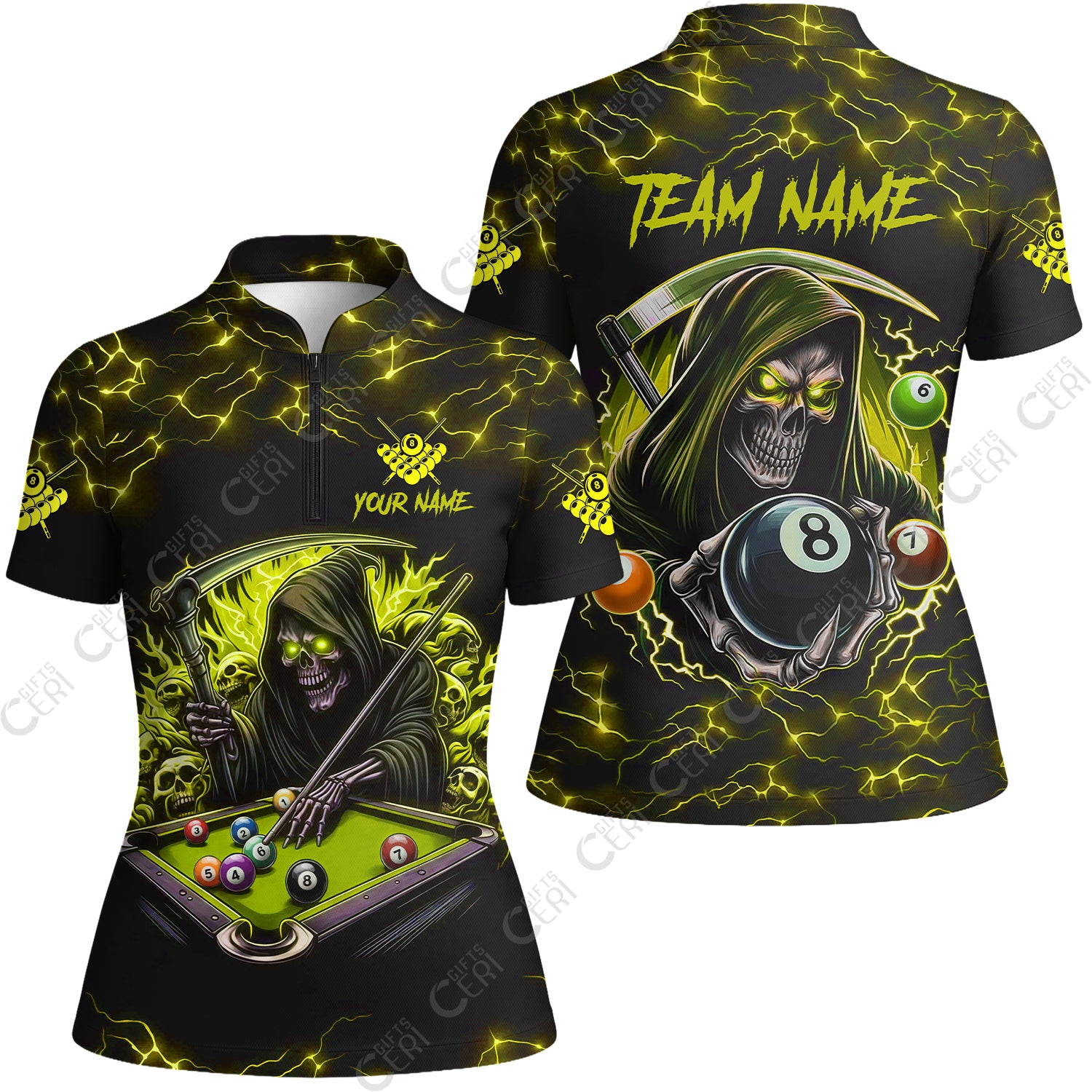 Customized Billiards Stand Collar Quarter Zip Short Sleeve Women's Shirt, Personalized Death Skeleton 8 Ball Jersey
