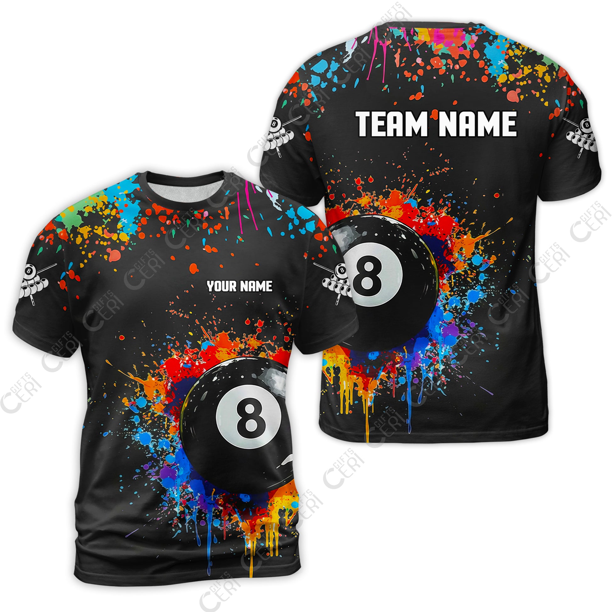 Customized Billiards T-Shirt, Colorful Painting Splatter 8 Ball Jersey