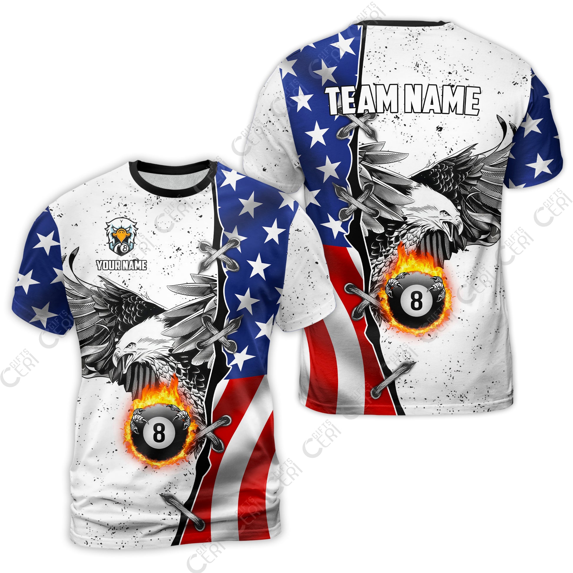 Customized Billiards T-Shirt, US Flag White Eagle Flame Pin Dust Pattern Personalized Billiard 8 Ball Jersey