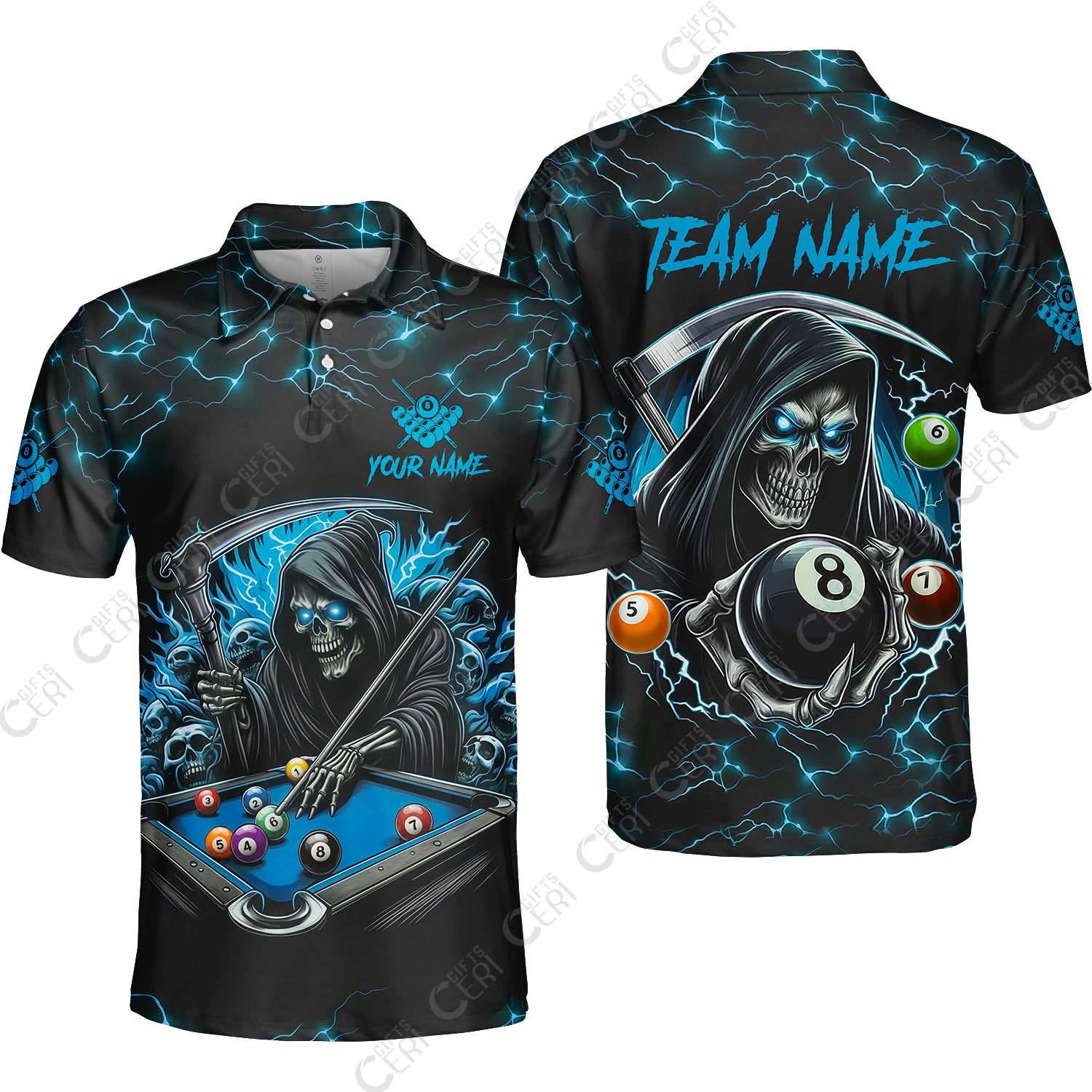Customized Billiards Unisex Polo Shirt, Personalized Death Skeleton 8 Ball Jersey Gift For Billiard Players