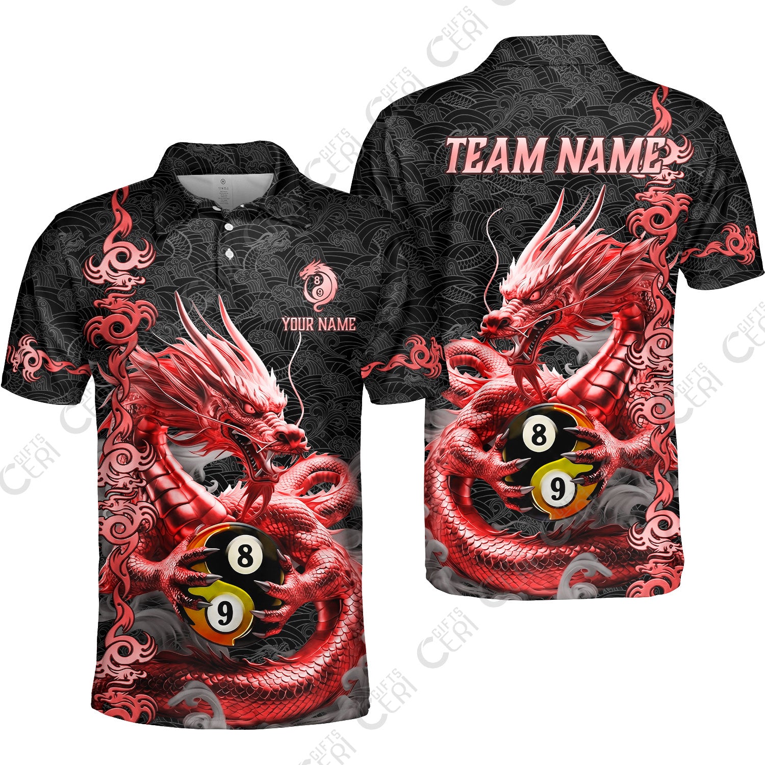 Customized Billiards Unisex Polo Shirt, Personalized Dragon Yin Yang 8 Ball 9 Ball Jersey Gift For Billiard Players