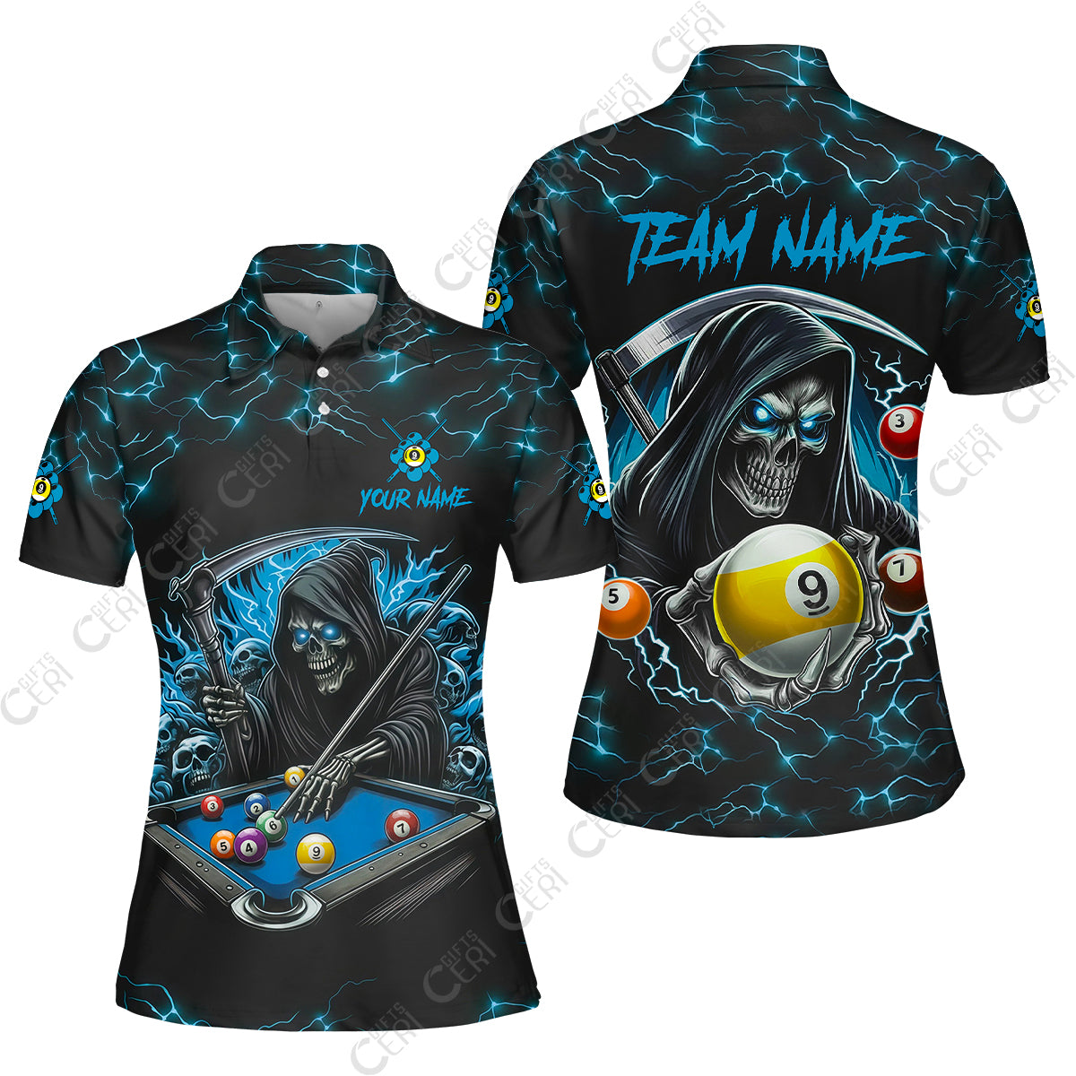 Customized Billiards Women Polo Shirt, Personalized Billiard Death Skeleton 9 Ball Jersey Gift For Billiard Players
