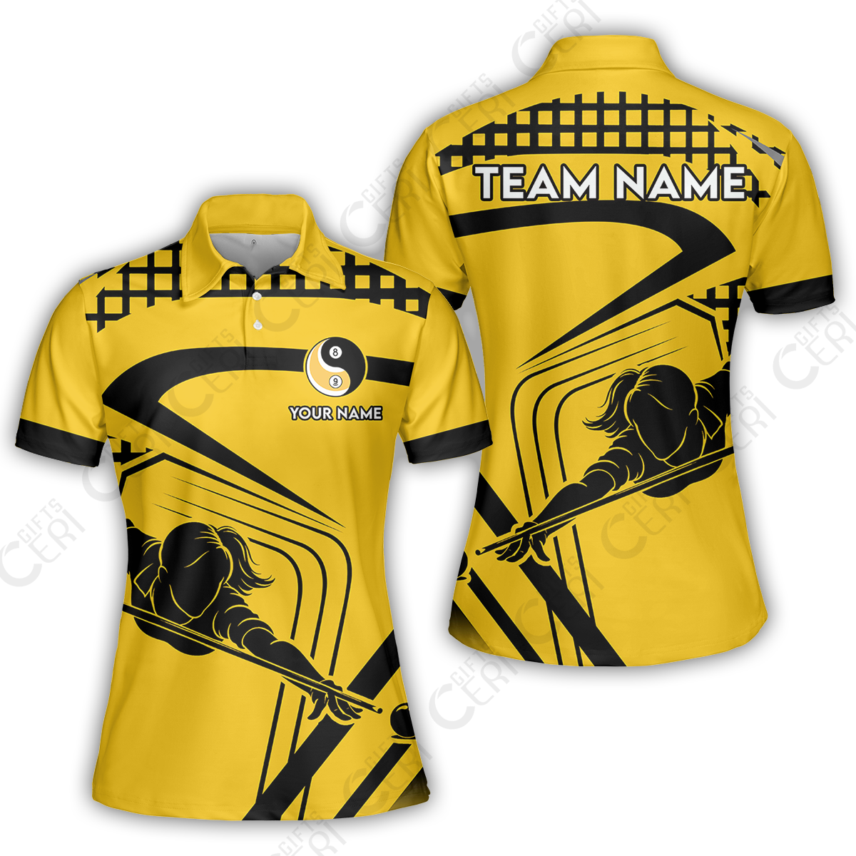 Customized Billiards Women Polo Shirt, Personalized Yellow Slash Yin Yang 8 9 Ball Jersey Gift For Billiard Players