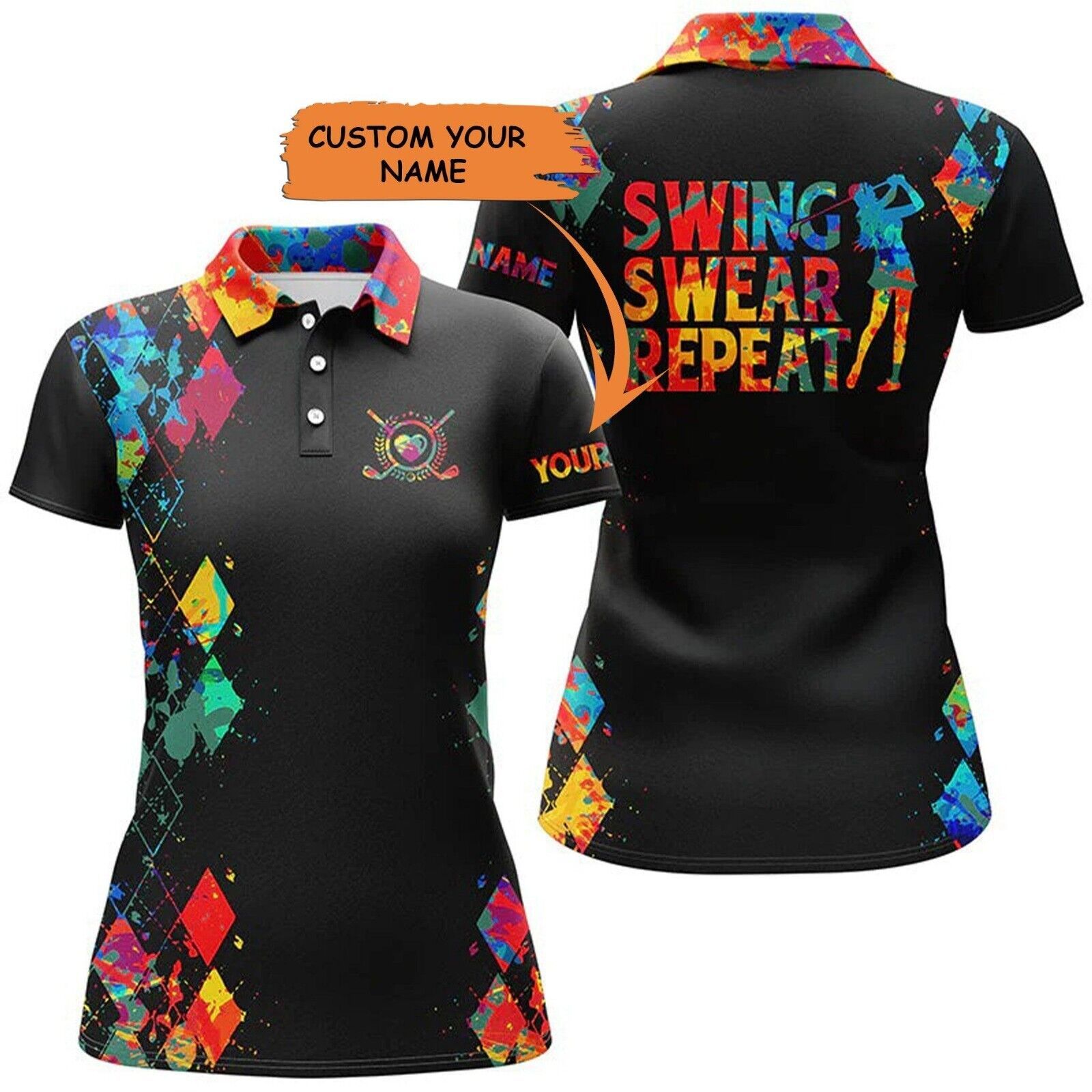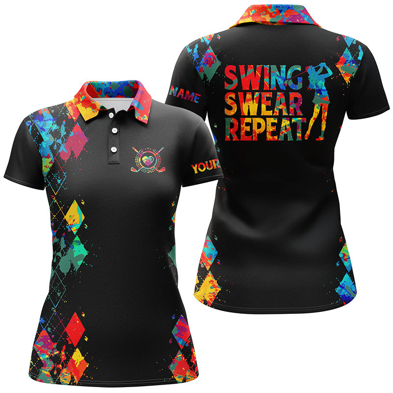 Customized Golf Women Polo Shirt, Watercolor Personalized Swing Swear Repeat Black Shirts - Perfect Gift For Ladies, Golf Lovers, Golfers