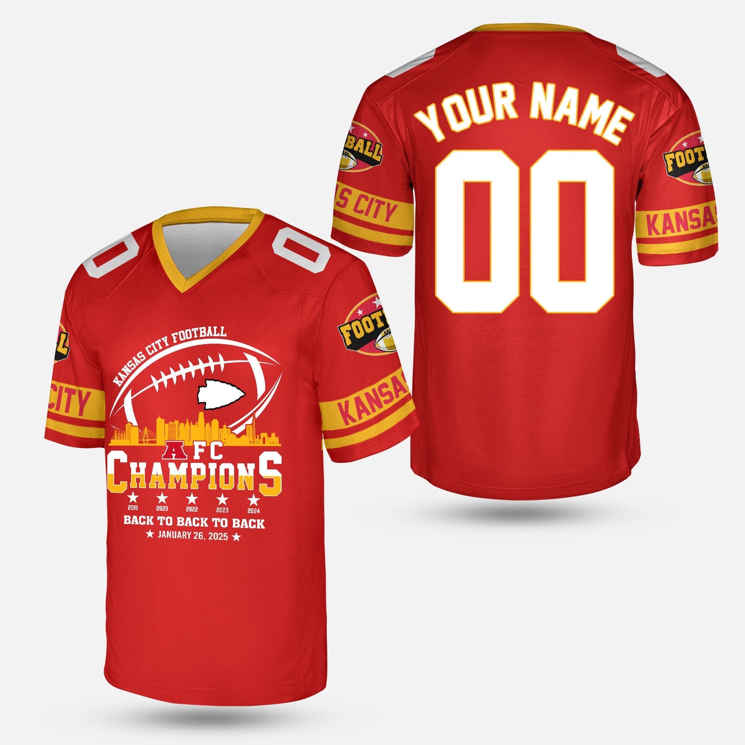 Customized Kansas City Football 2024-2025 AFC Champions 2 Sided Long Sleeve Shirts Skyline, American Football Champs Outfit For Football Fans