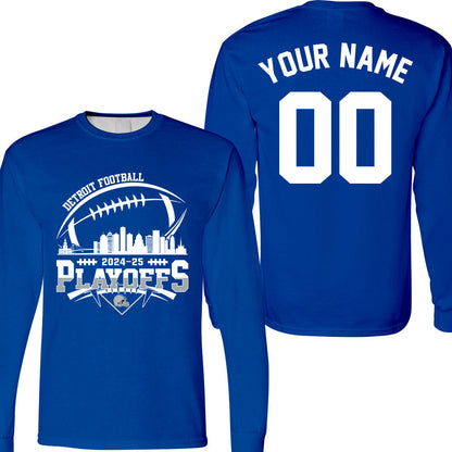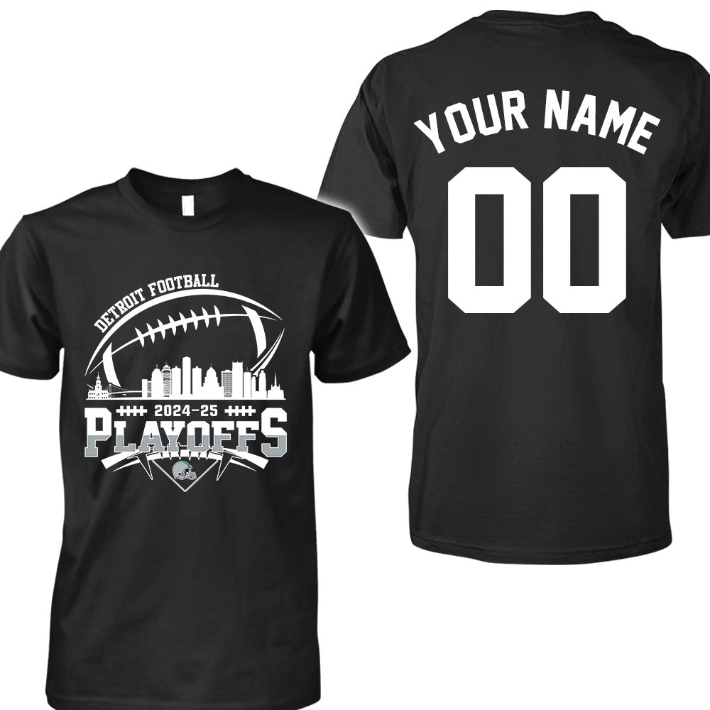 STYLE & COMFORT: Detroit American Football 2024-25 Playoffs Skyline Double Sided Shirts for Men and Women are the perfect balance between style & comfort. Made from unique moisture-wicking technology, the shirt's fit keeps you feeling relaxed, fashionable all season long, and long-lasting for any outdoor activity. Also, you can wear Football Shirt to relax or simply hang out with friends and family.