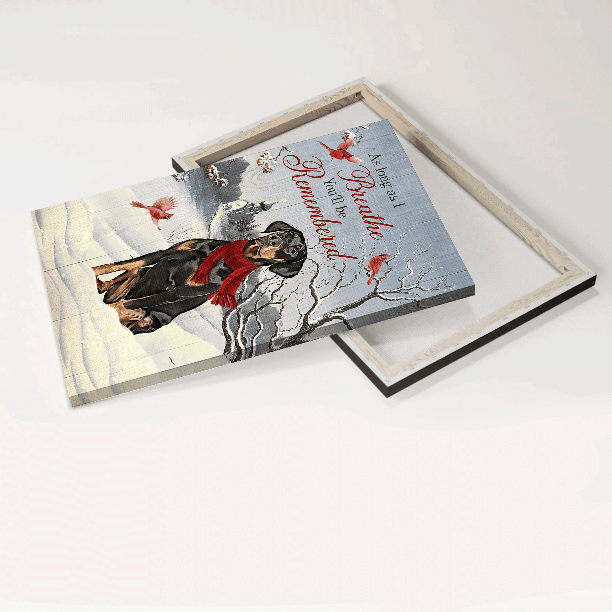 Doberman Portrait Canvas- Doberman painting, Winter, Cardinal canvas- Gift for Doberman lover- As long as I breath, You'll be remembered is emotional wall art that can be decorated in any room in homes such as the living room, bedroom, or entryway.
