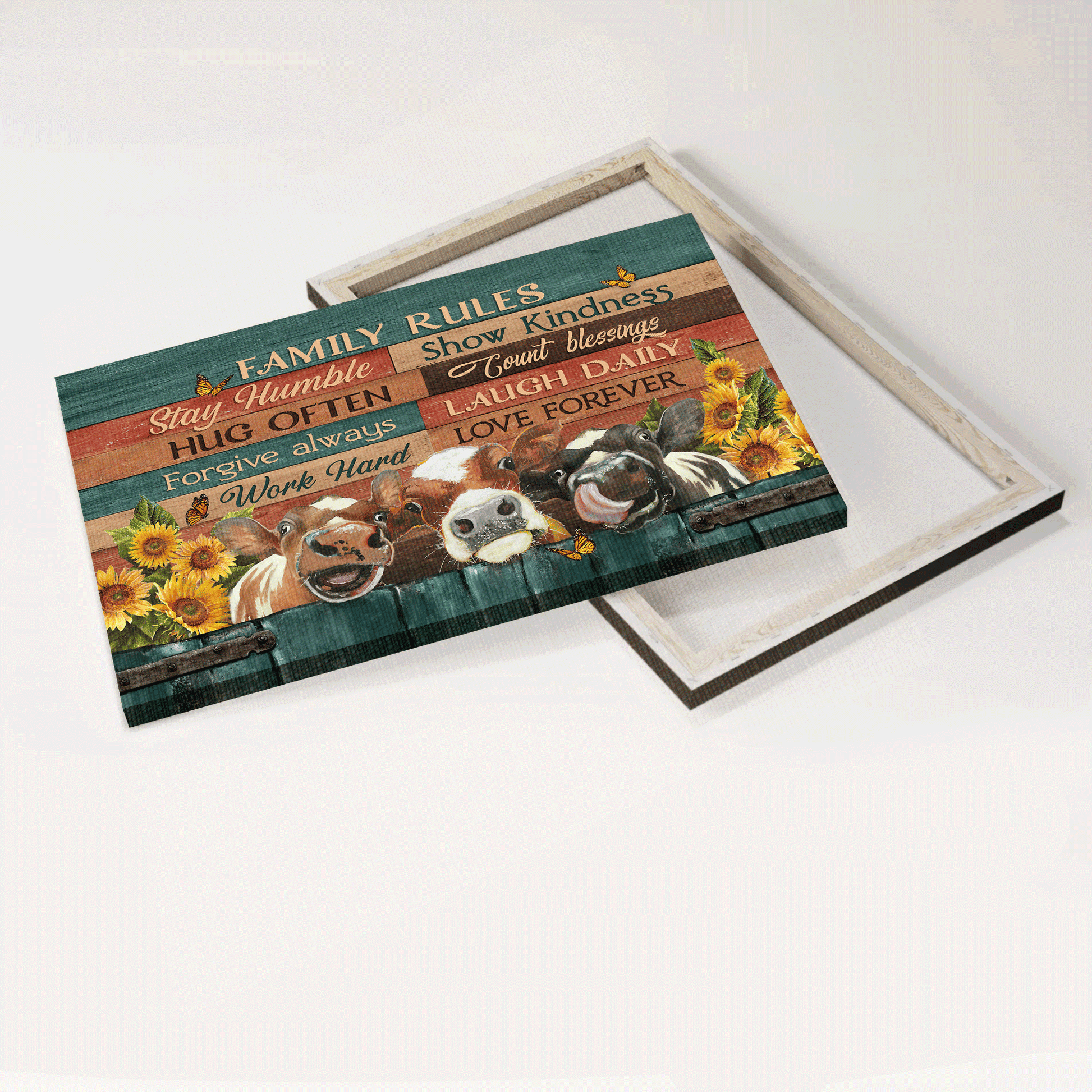 Family Landscape Canvas- Beautiful Dairy Cow, Sunflower Field, Orange Butterfly Canvas- Gift For Members Family- Family Rules.