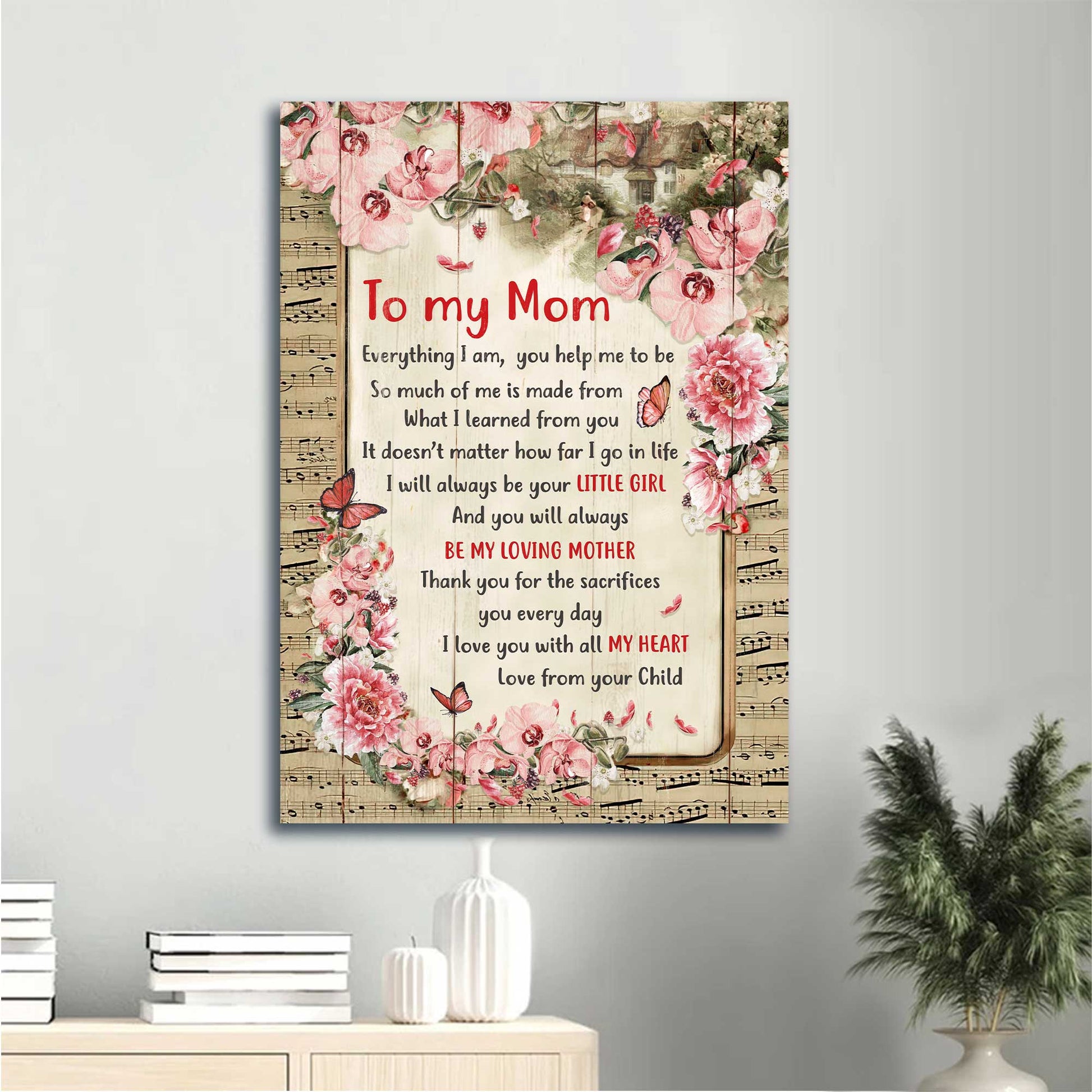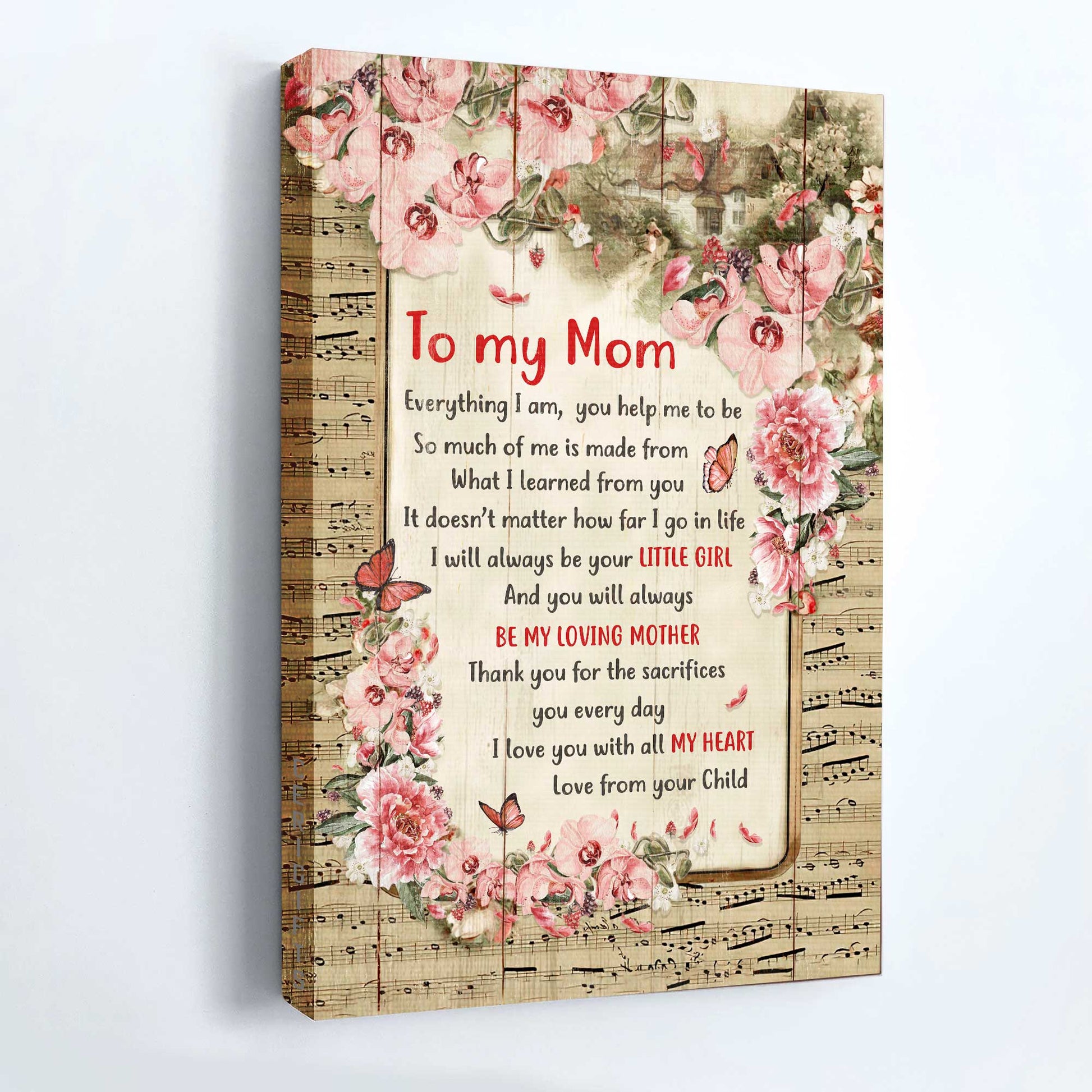 Family Portrait Canvas- To my mom canvas, Daughter to mom, Music sheet, Beautiful butterfly canvas- Gift for mom, mother- Be my loving mother.