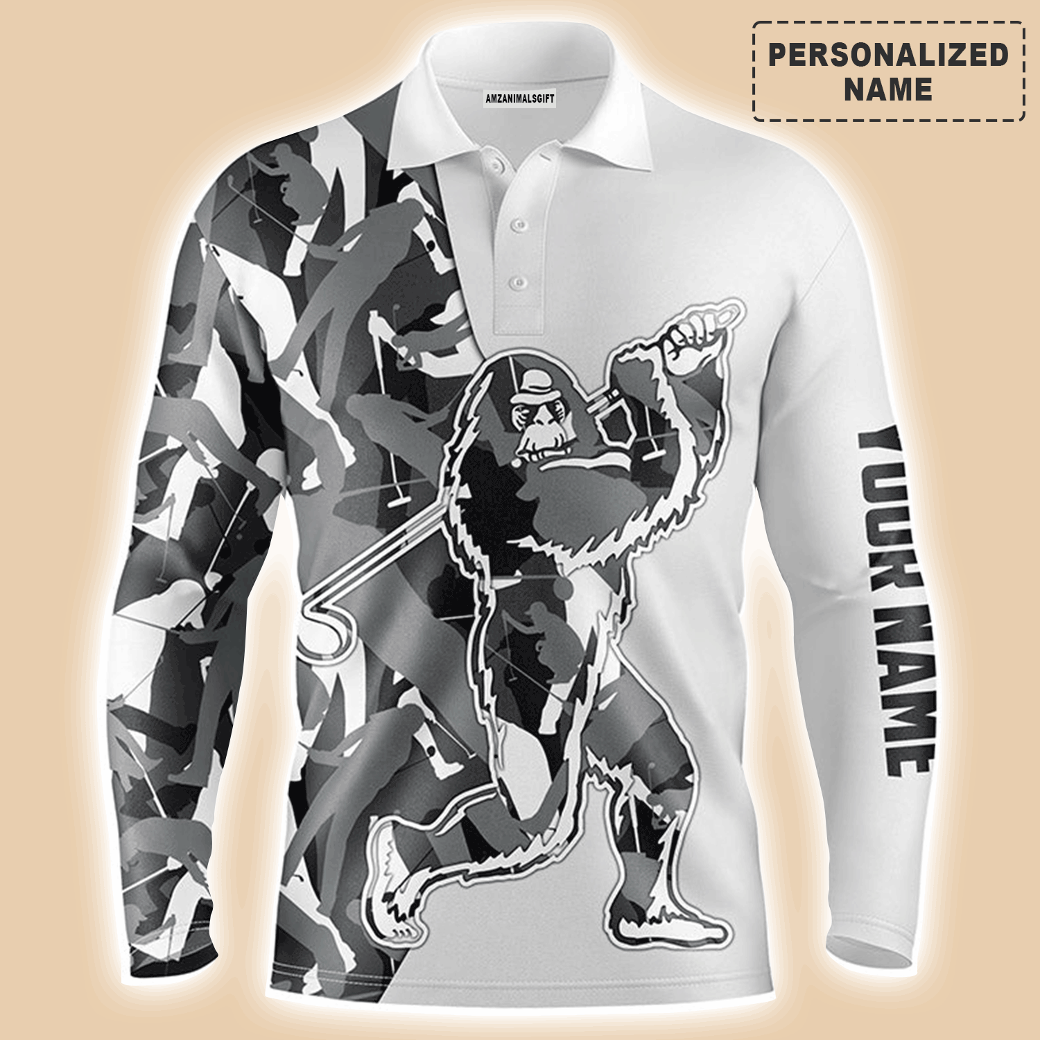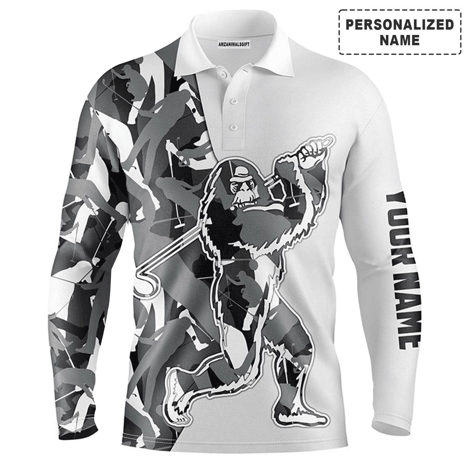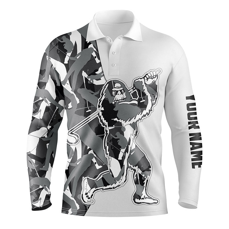 Funny Bigfoot Golf Men Polo Shirt-Custom Gray Camo Pattern Sasquatch Playing Golf Apparel Men Polo Shirt-Personalized Sports Gift For Men, Golf Lover