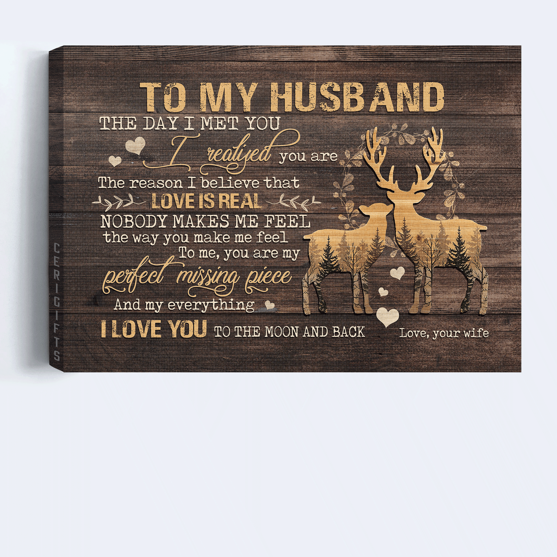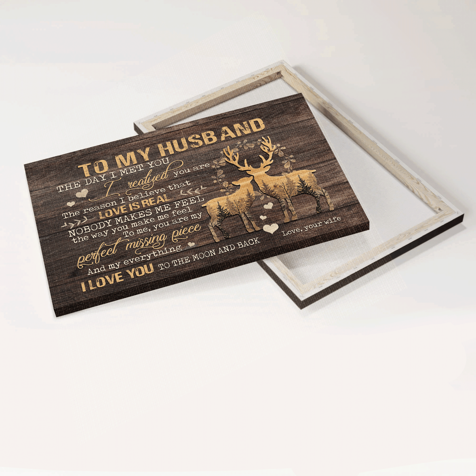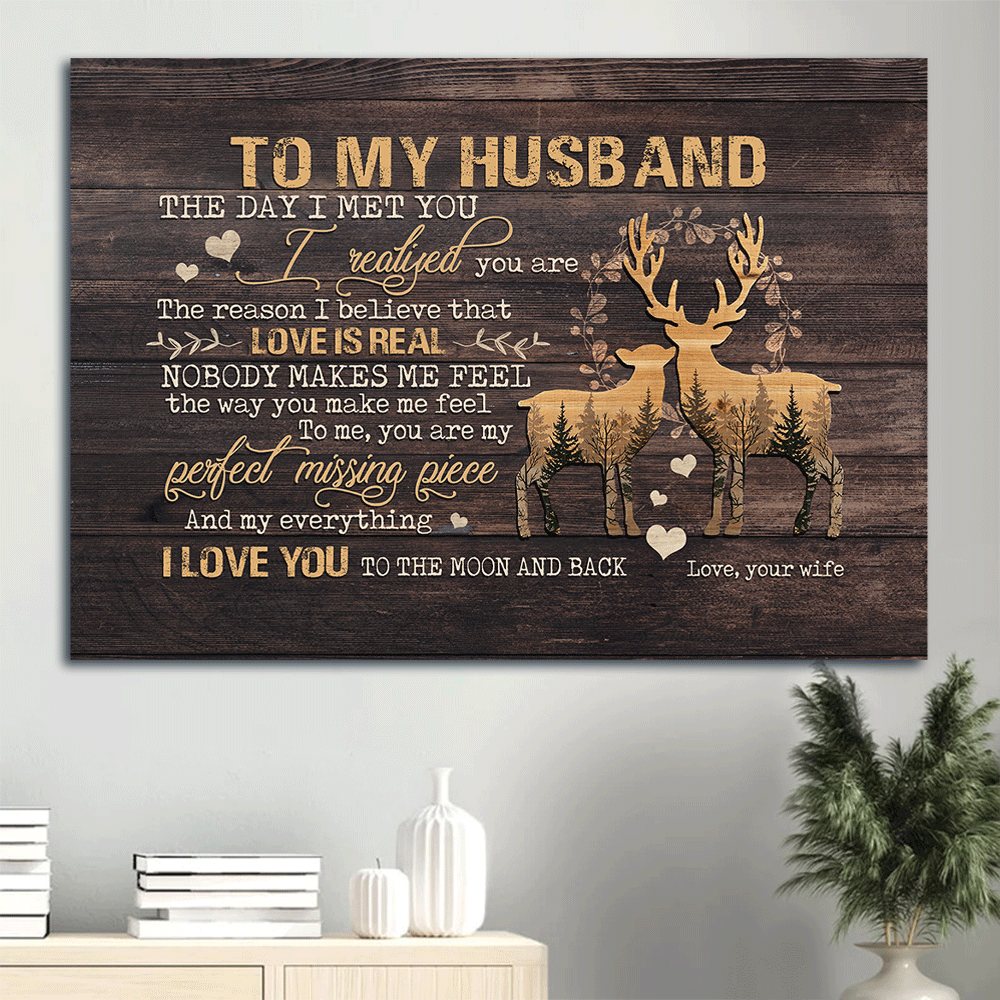 Let this message describe how you feel to your sweetheart. This stunning Gift For Husband Landscape Canvas - To My Husband, Deer Carving, Deer Couple, Couple Canvas - Valentine's Day Gift For Couple, Spouse, Lover - You Are My Perfect Missing Piece Canvas Prints, Wall Art will look great in any room of your home, including the kitchen, bedroom, living room, and even the backyard.