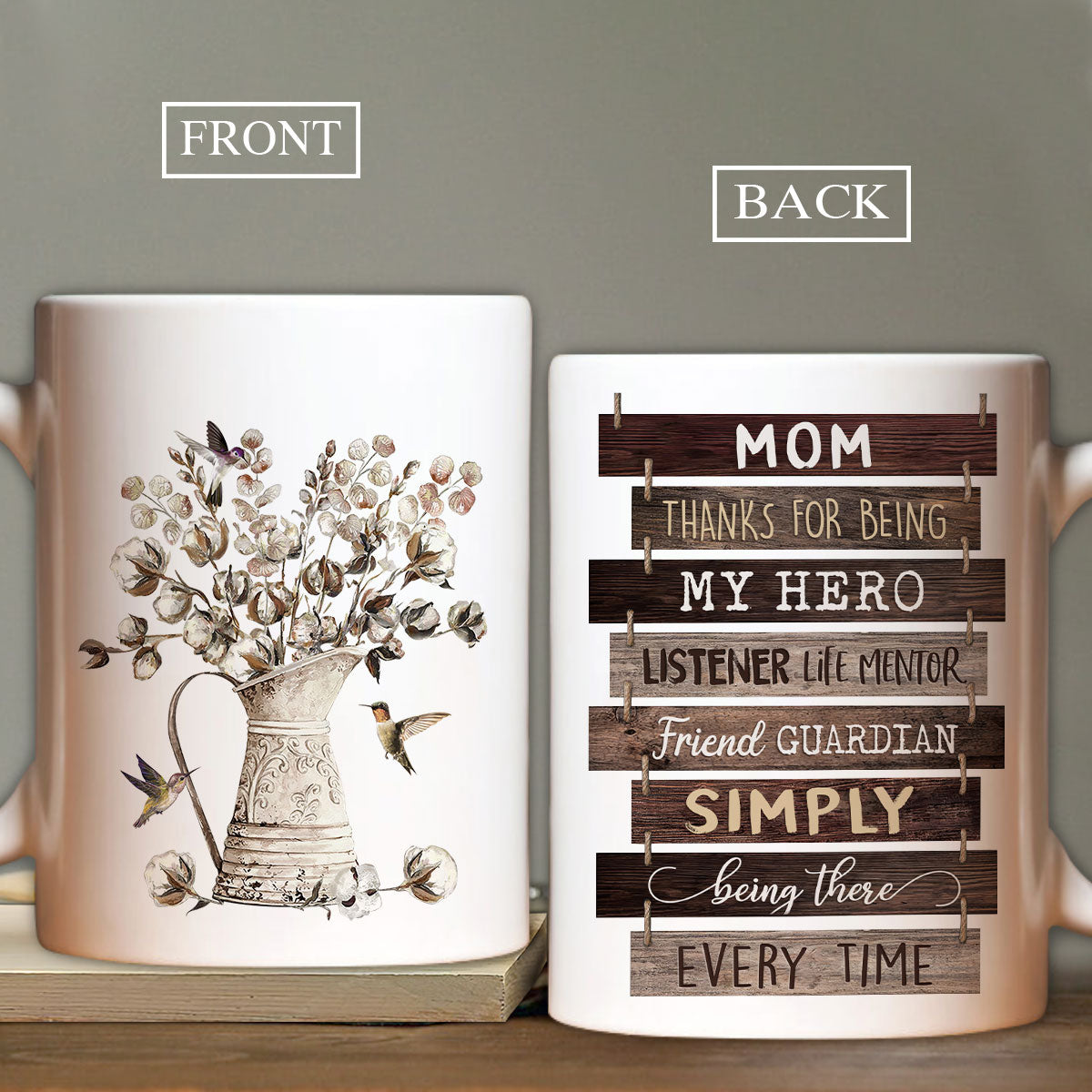 Gift For Mom Mug - Daughter to mom, Cotton flower, Hummingbird Mug- Gift For Mother's Day, Presents for Mom, Anniversary- Thanks for being my hero Mug