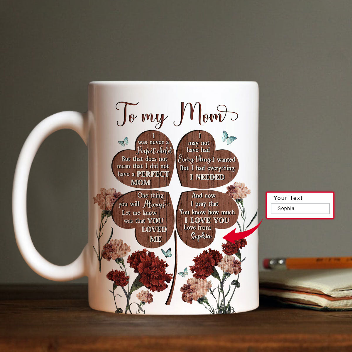 Gift For Mom Personalized Mug - Daughter to mom, Blue butterfly, Carnation Mug - Custom Gift For Mom From Daughter Son, Mother's Day, Anniversary, Birthday, Presents for Mom - I love you mom Mug