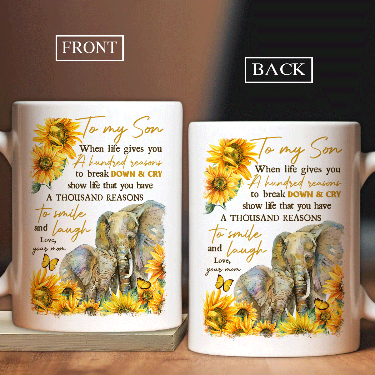 Gift for Son - Mom to son, Watercolor elephant, Sunflower painting, To my son mug- You have a thousand reasons to smile and laugh - Family White Mug