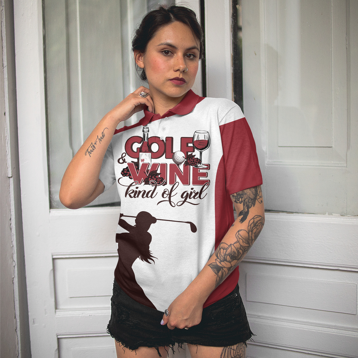 Golf And Wine Kind Of Girl Golf Short Sleeve Women Polo Shirt, White And Red Golf Women Polo Shirt, Golf Shirt For Wine Lovers