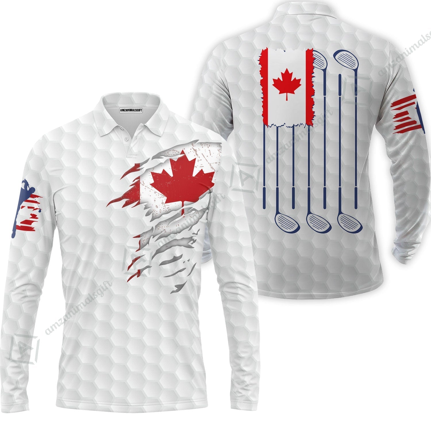 Golf Canada Flag Long Polo Shirt, Red Maple Leaf Golfing Shirt, Canadian Golf Long Polo Shirt