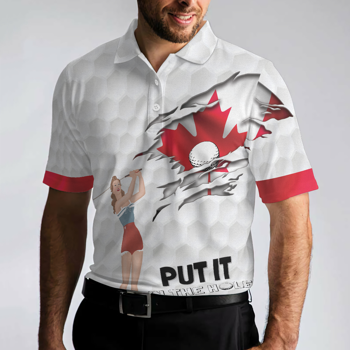 Golf Canada Flag Pin Up Girl Polo Shirt, Put It In The Hole Polo Shirt, Canadian Golf Shirt For Men