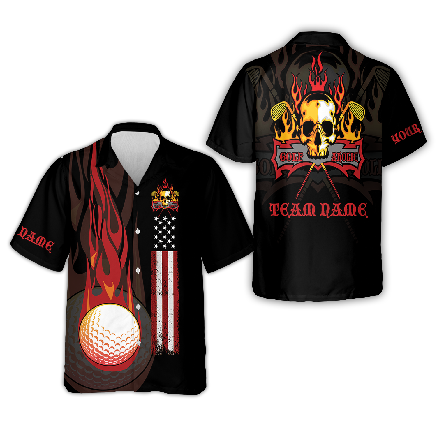 Golf Men Polo Shirt - Flame Skull Golf Ball American Flag Custom Name Apparel - Personalized Gift For Golf Lover, Team, Husband, Men, Patriotic