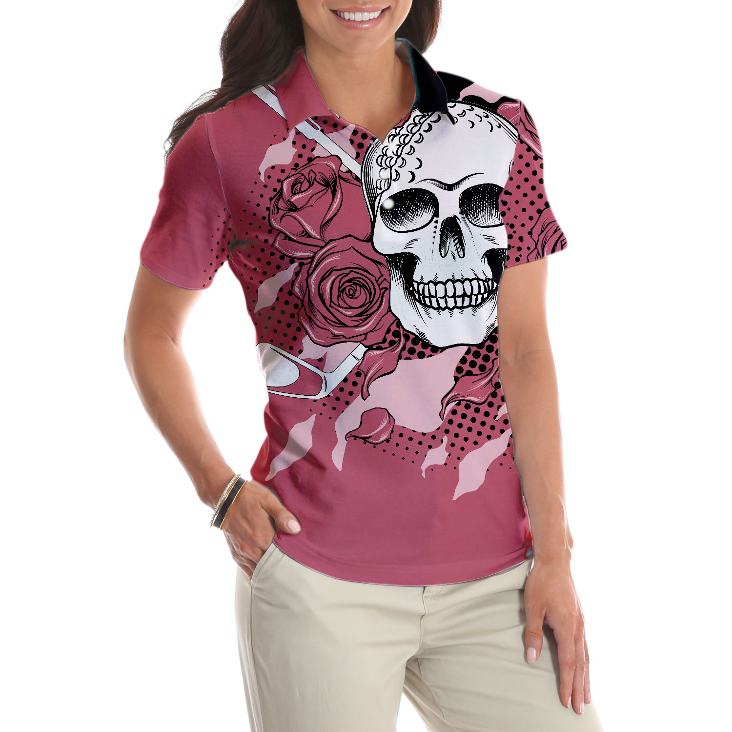 Golf Pink Skull Ladies Short Sleeve Women Polo Shirt, Rose Golf Shirt For Ladies, Cool Female Golf Gift
