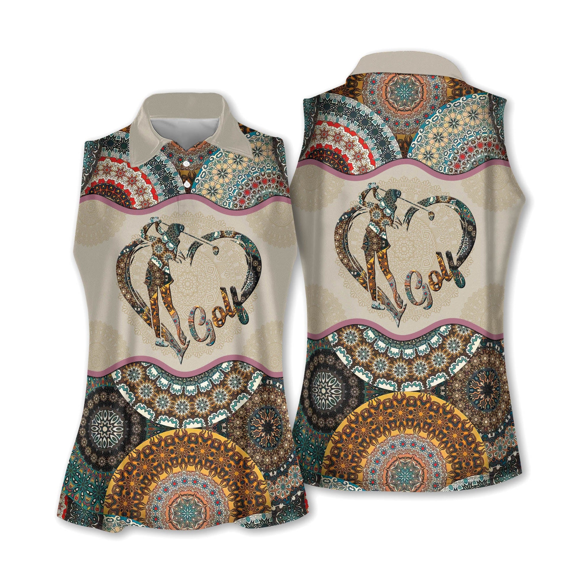 Golf Women Sleeveless Athleisure Polo Shirt, Mandala Madala Style Heart Sleeveless Polo Shirt For Female - Gift Sport For Mother's Day, Golfers