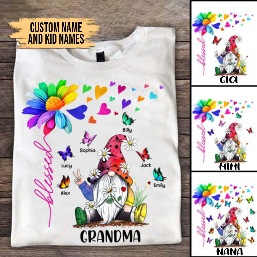 Grandma and Kids Custom Name T-shirt, Colorful Flower Blessed Grandma Gnome Butterfly Personalized Shirt - Perfect Gift For Gigi, Nana, Mimi, Grandma
