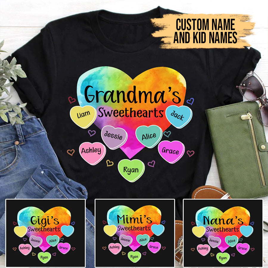 Grandma and Kids Custom Name T-shirt, Grandma Sweethearts With Grandkids Heart Color Art Personalized Shirt - Perfect Gift For Gigi, Nana, Mimi, Grandma