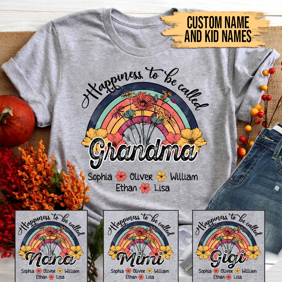 Grandma and Kids Custom Name T-shirt, Vintage Flower Happiness To Be Called Grandma By Grandkids Personalized Shirt - Perfect Gift For Gigi, Nana, Mimi, Grandma