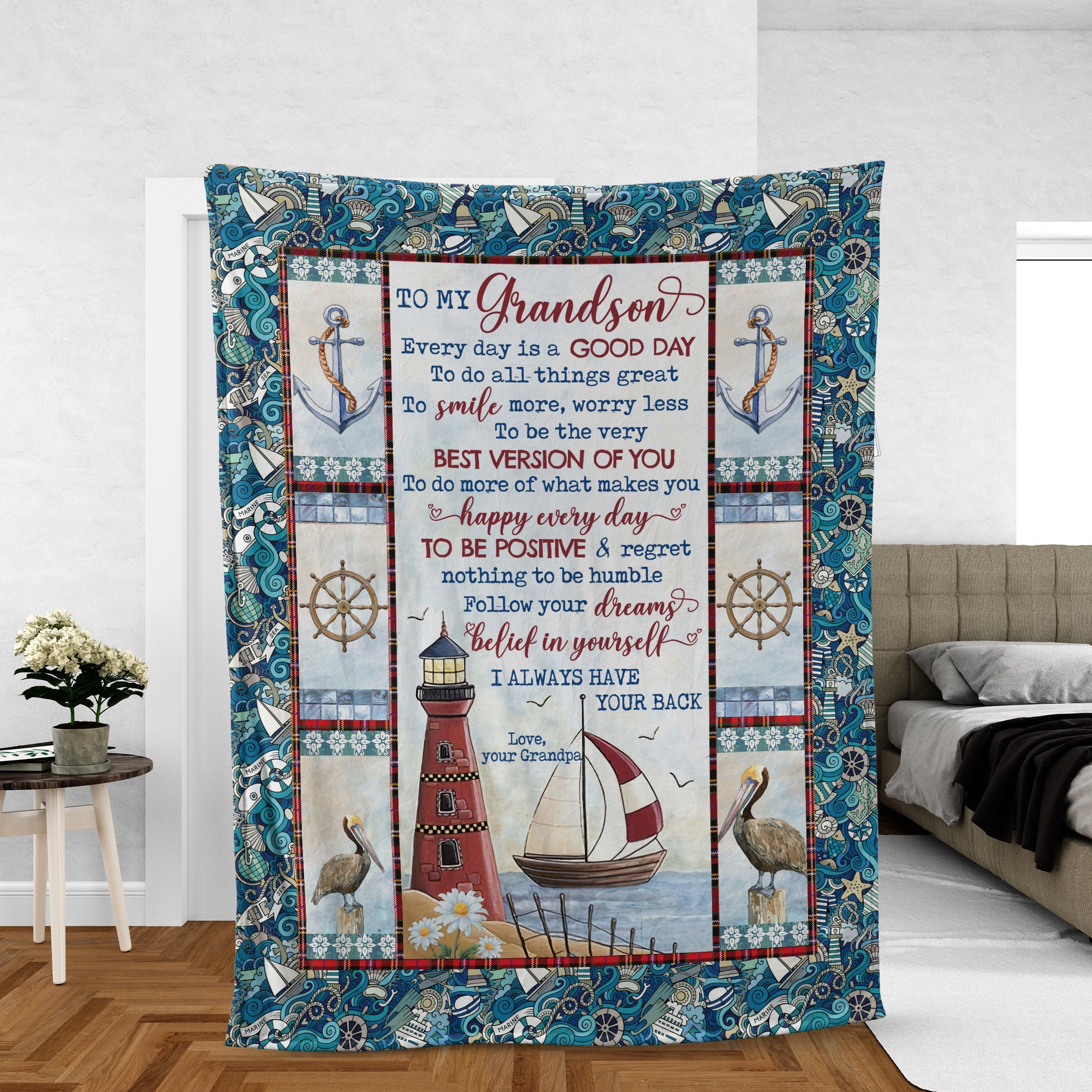 Grandson Blanket, Family Blanket, Perfect Gift For Grandson From Grandma, Grandpa - Red Lighthouse, Boat And Blue Ocean, I Always Have Your Back