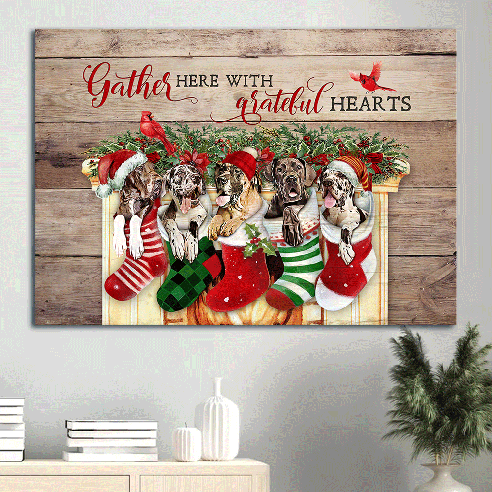 Great Dane Landscape Canvas- Great Dane, Christmas Sock, Cardinal - Gift for dog lover- Gather here with grateful hearts - Dog Christmas Landscape Canvas Prints, Wall Art.