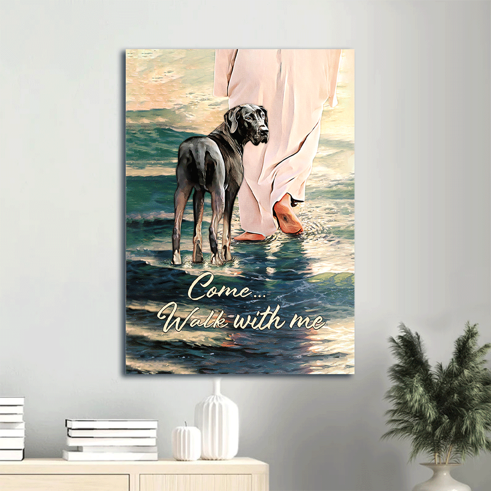 Great Dane Portrait Canvas- Great Dane, On the river, Jesus Painting, Walks with God- Gift for Christian, Dog lover- Jesus Portrait Canvas Prints, Wall Art.