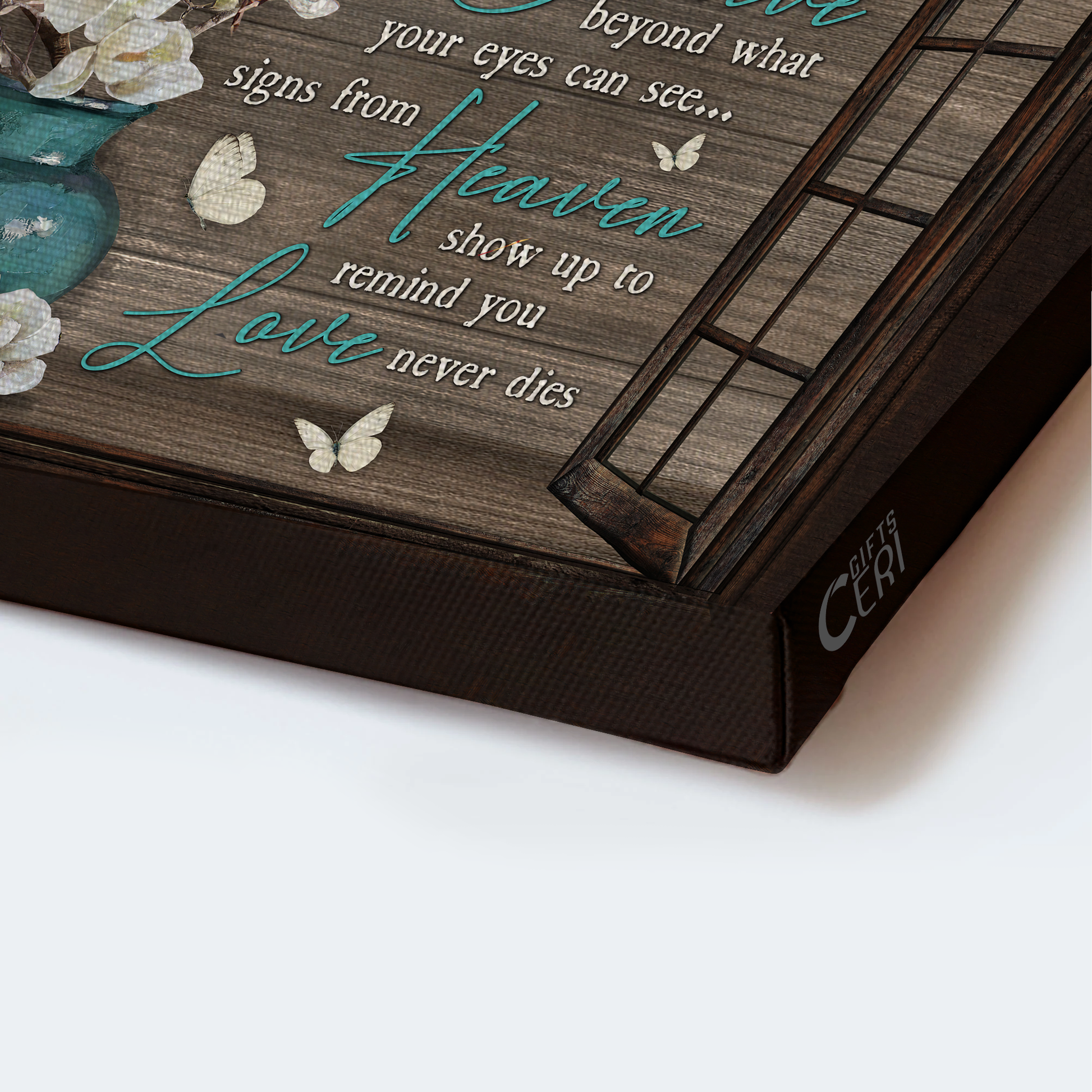 Heaven Landscape Canvas - White Flower, White Butterfly, Window Frame Memorial Canvas - Memorial Gift For Member Family - Love Never Dies Canvas