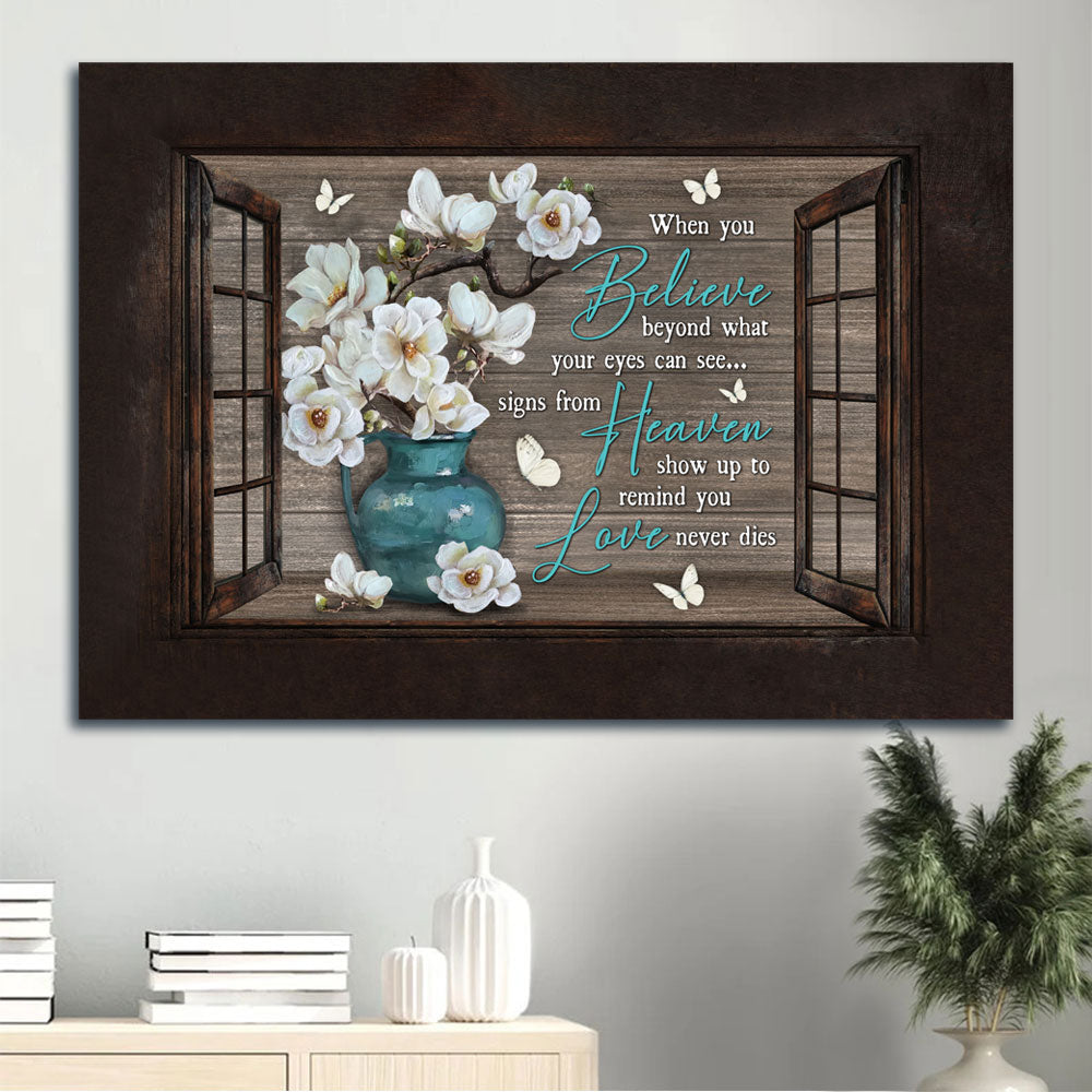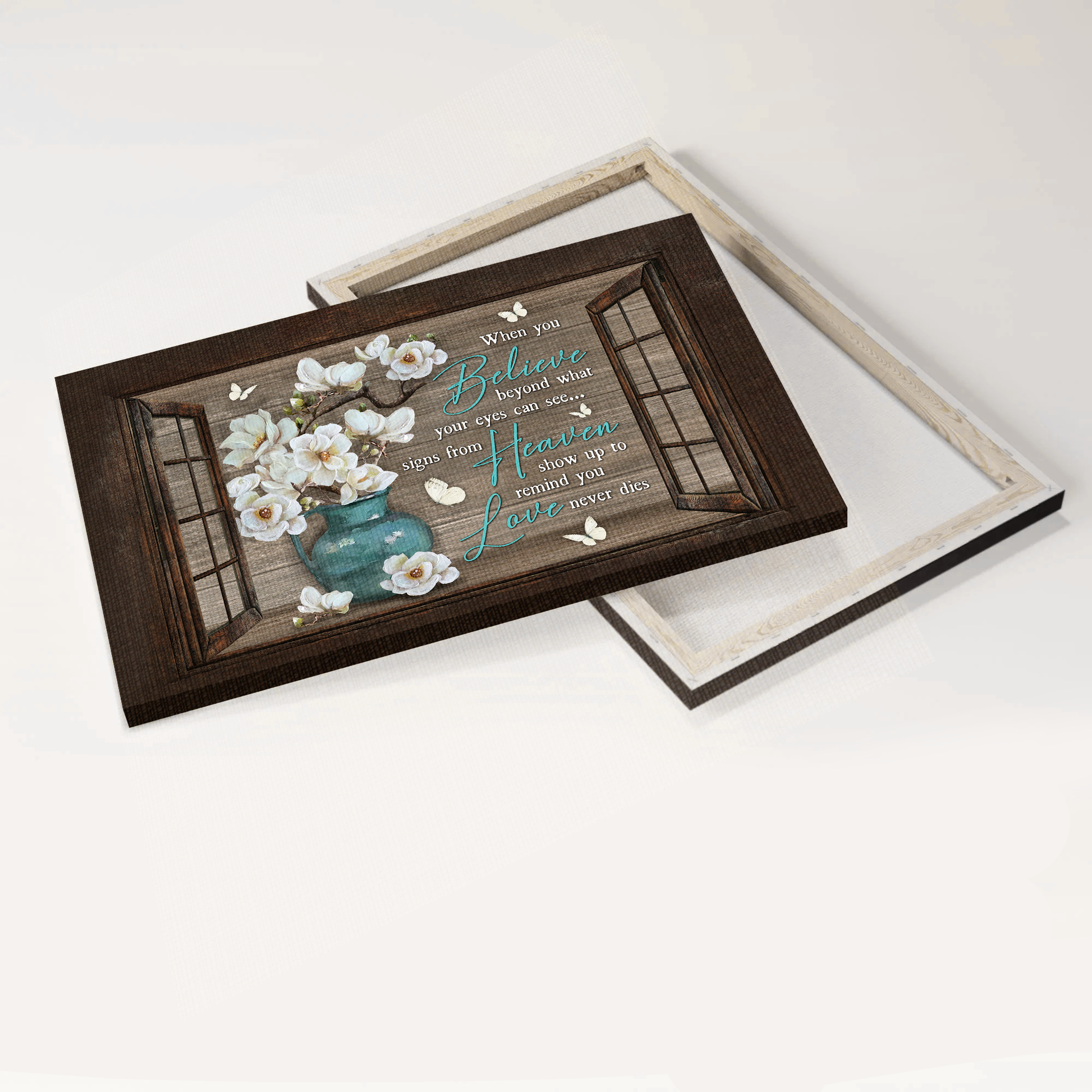 The image of the white flower and meaningful quotes of this amazing Heaven Landscape Canvas - White Flower, White Butterfly, Window Frame Memorial Canvas - Memorial Gift For Member Family - Love Never Dies Canvas Prints, Wall Art will definitely be a meaningful gift not only for your friend but also for your lover and your family. This wonderful canvas will be suitable for any room in your house from the kitchen, bedroom, and living room to outside space.
