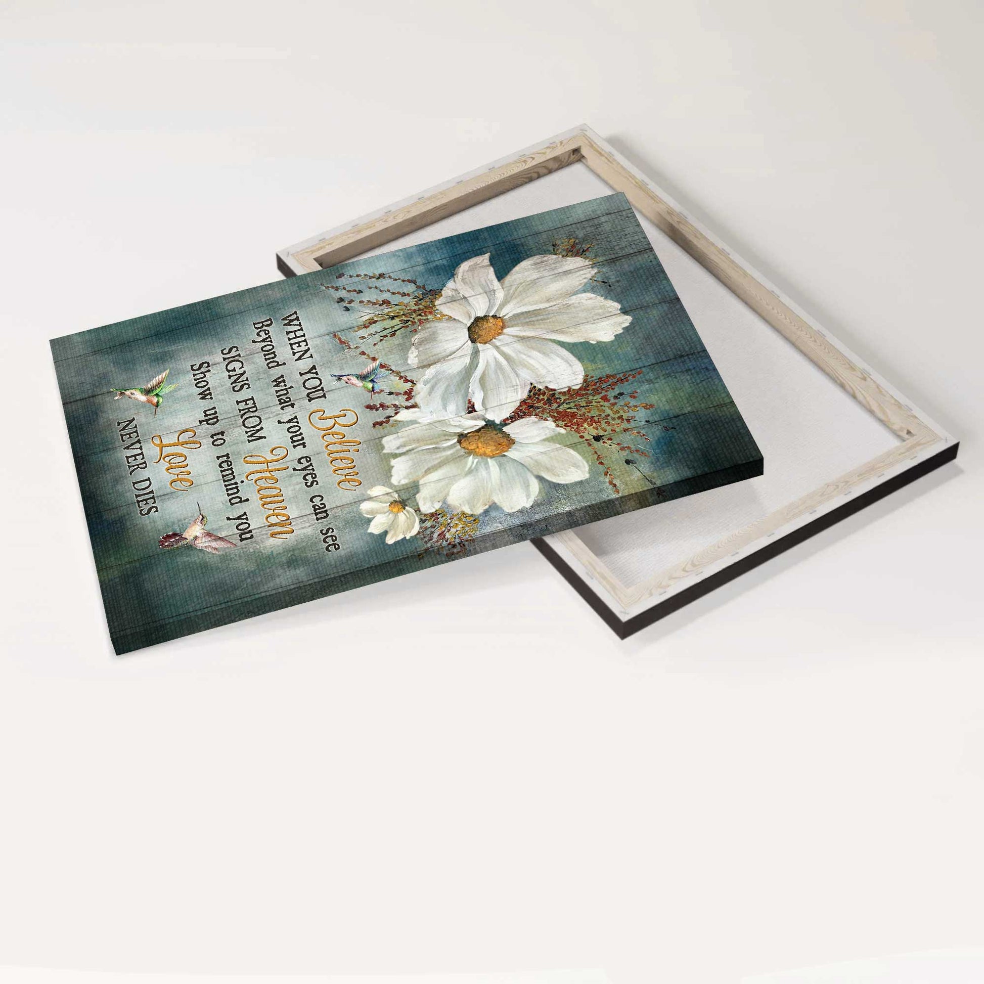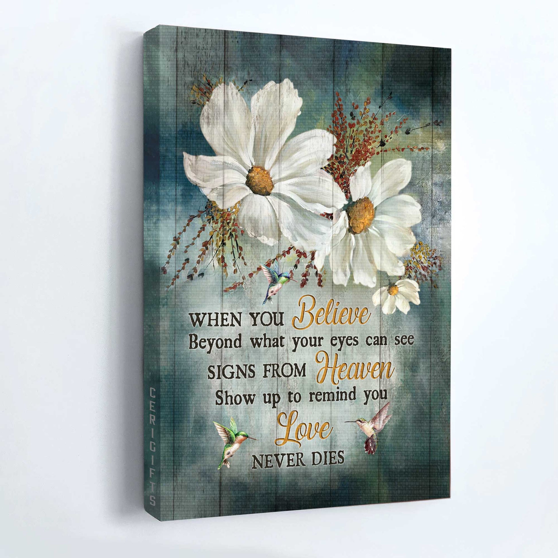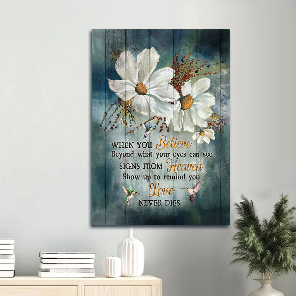 Heaven Portrait Canvas - White Daisy Flower, Hummingbird Memorial Canvas - Memorial Gift For Member Family - Love Never Dies Canvas Prints, Wall Art is an emotional picture that can be decorated in any room in home such as the living room, bedroom or even outdoor space.