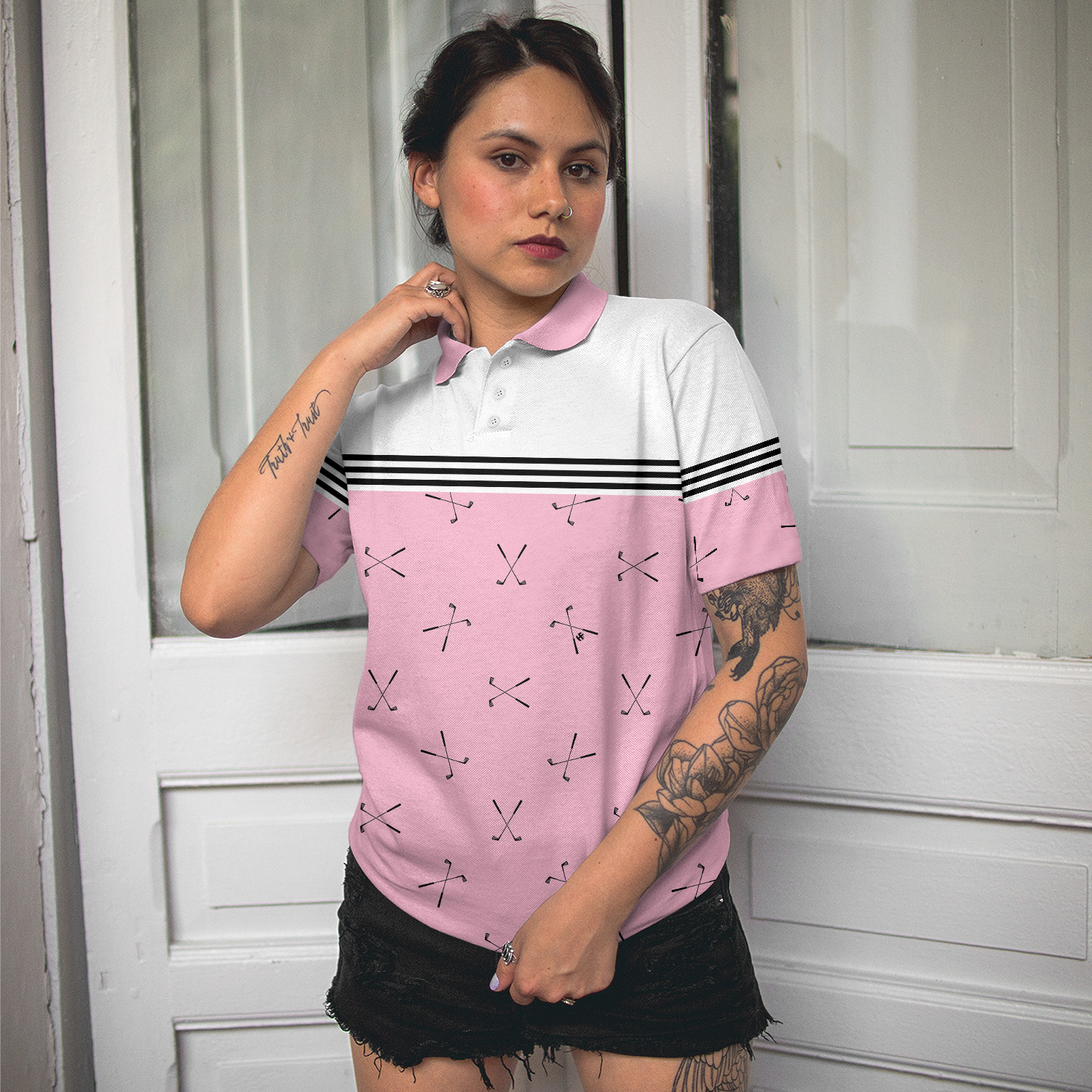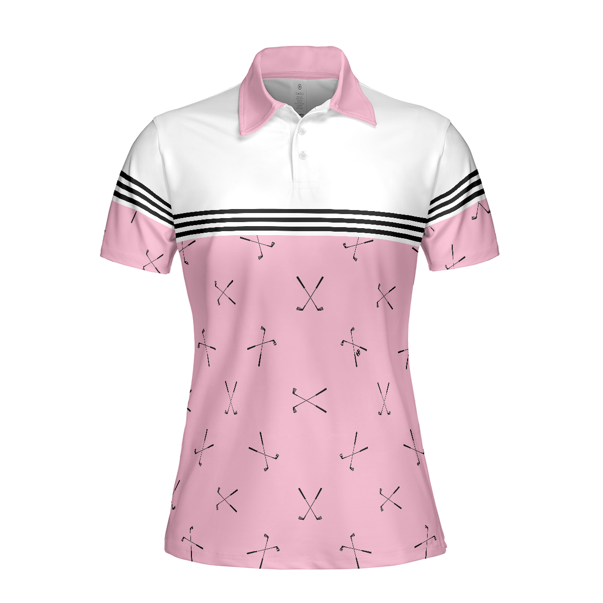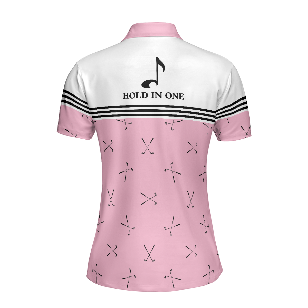 Hole In One Pink Golf Short Sleeve Women Polo Shirt, Golf Club Repeat Pattern Golfing Shirt, Pink Shirt For Women