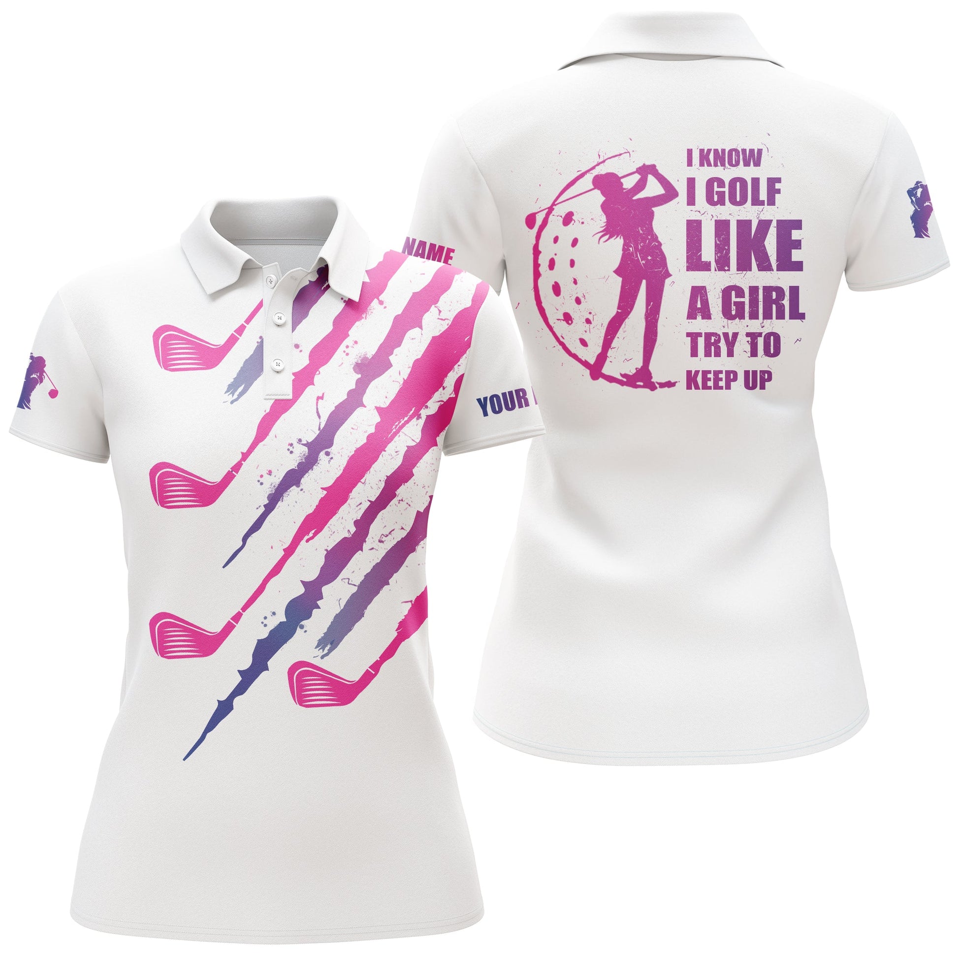 I Know I Golf Like A Girl Try To Keep Up Pink White Women Golf Polo Shirts Custom Name Golfing Gift, Perfect Gift For Women