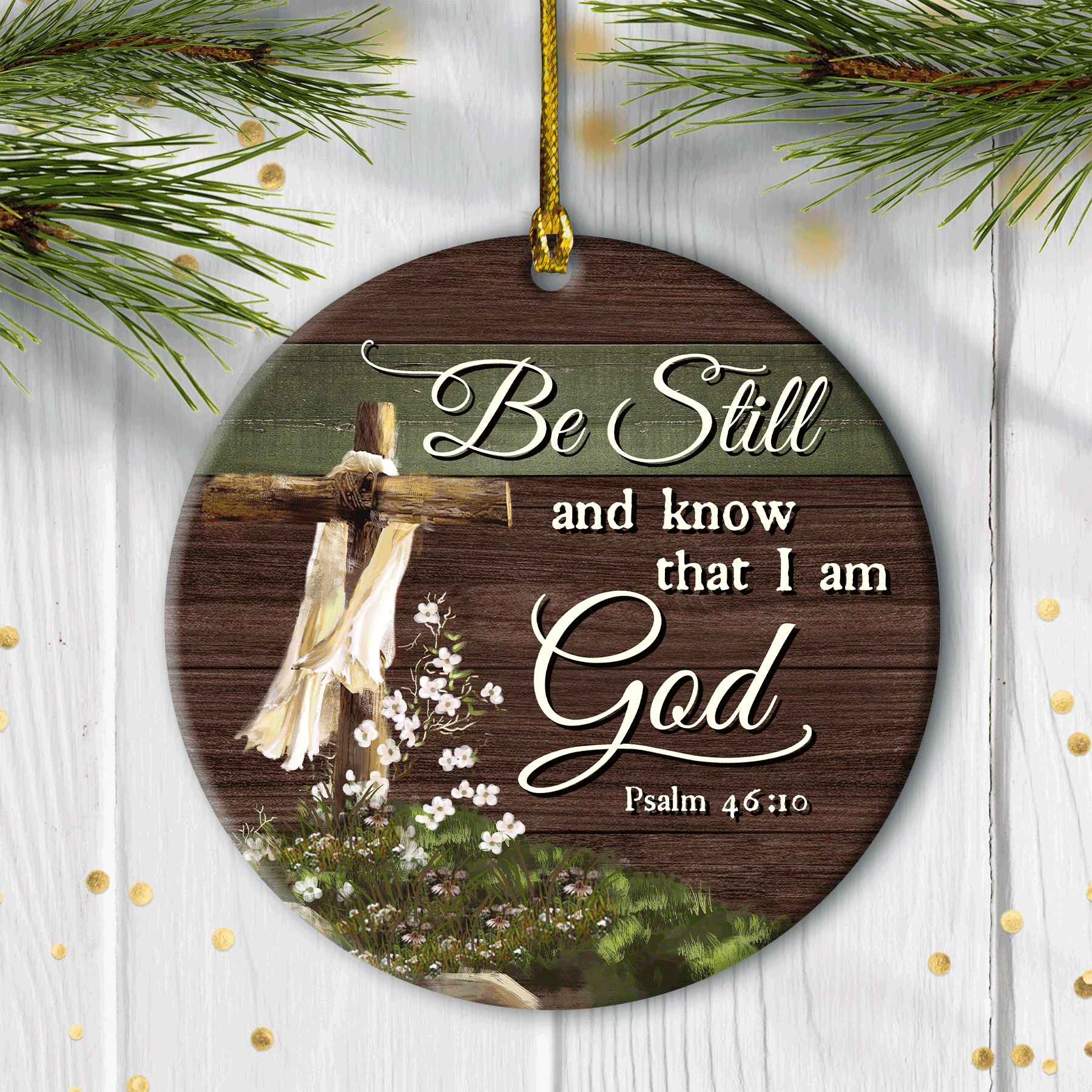 Jesus Circle Ceramic Ornament- Flower field, Wooden Cross- Gift For Religious Christian- Be Still And Know That I Am God