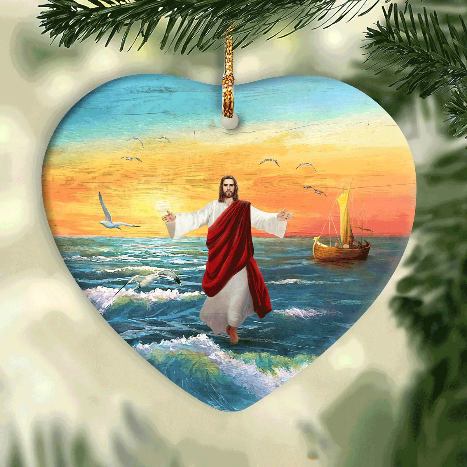Jesus Heart ceramic Ornament- Jesus Is Light, My Savior, Jesus Walks On The Water, Sunset Heart ceramic Ornament - Christian Gift